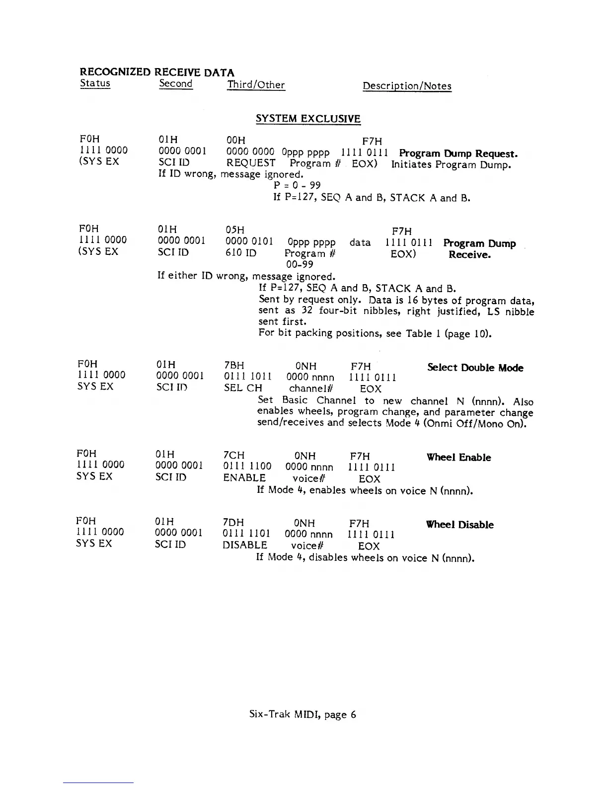 Sequential Six-Trak - System Exclusive MIDI Reception