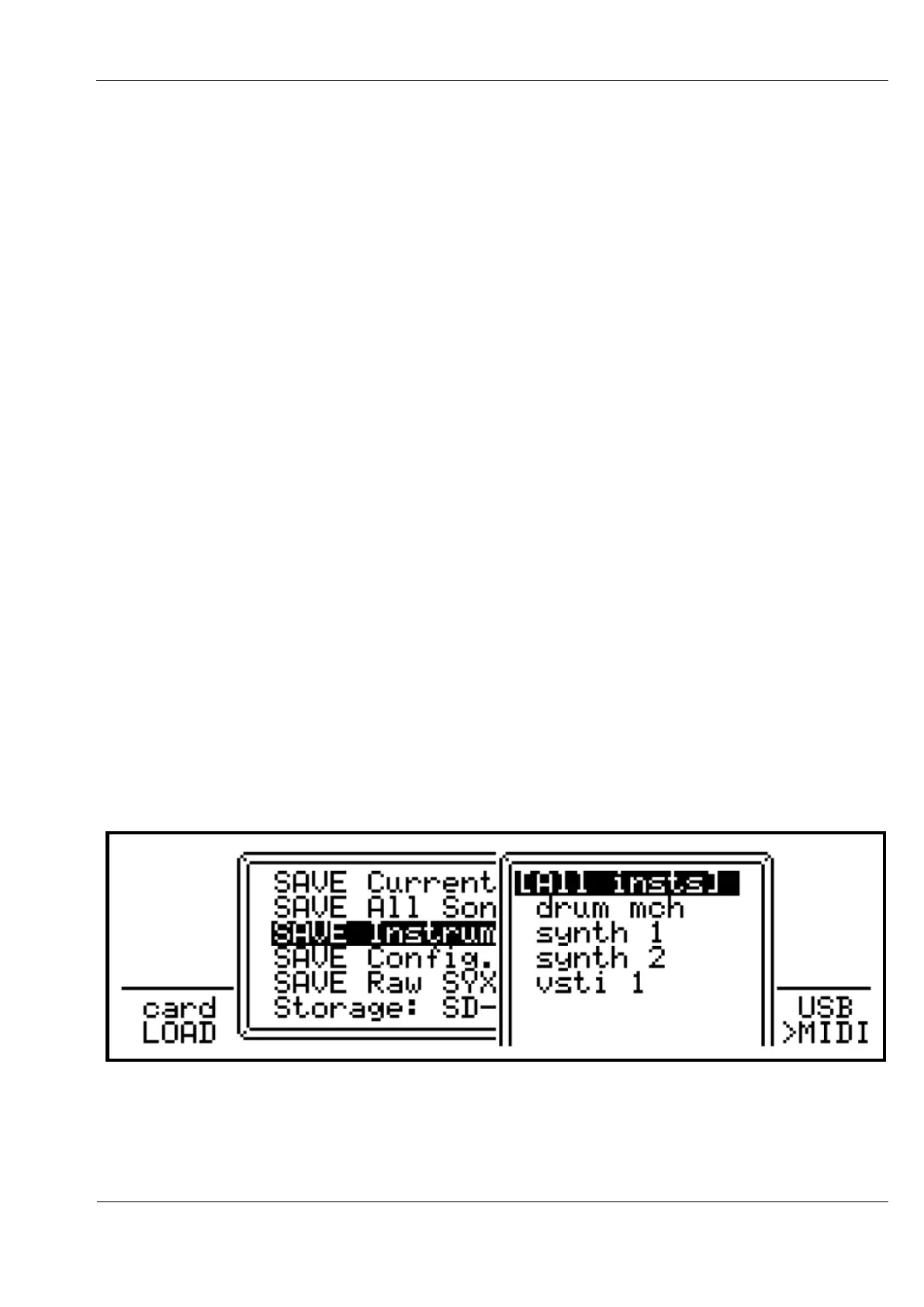 After selecting the instrument to save, a filename and path page similar to the song save page