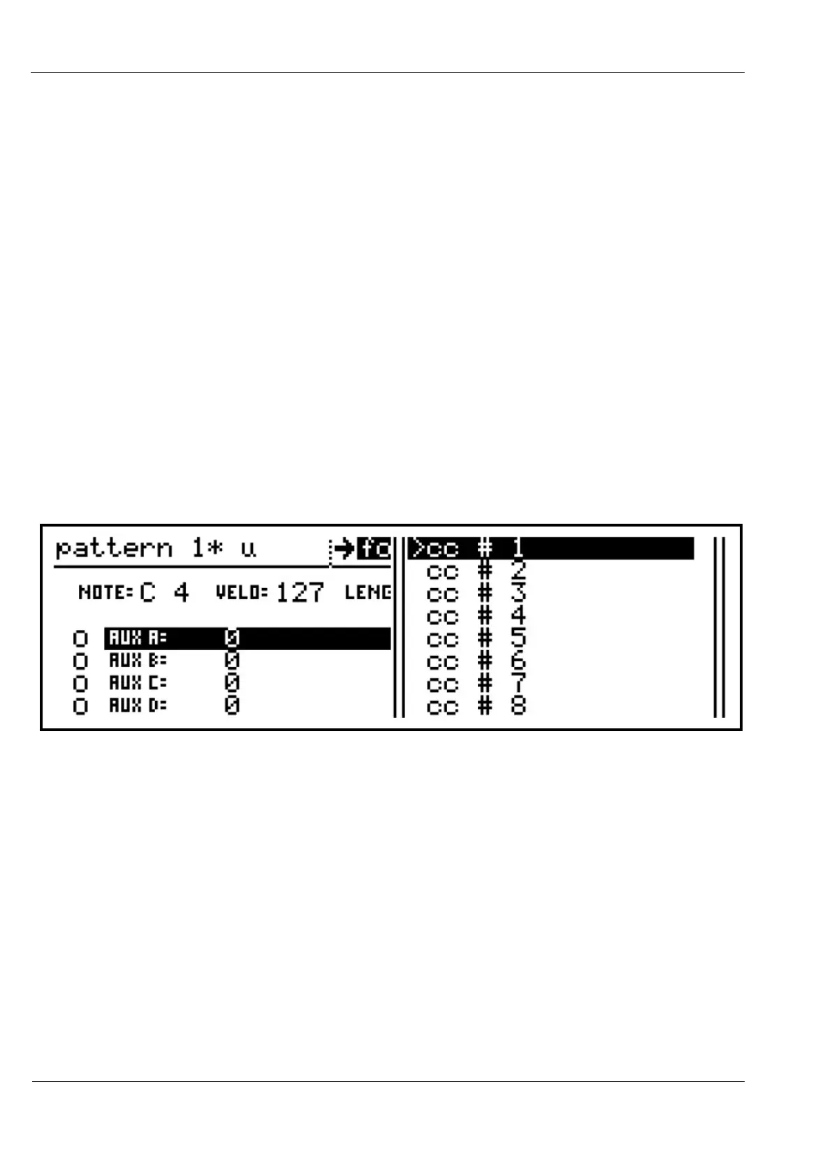 In a new P3 pattern, the aux rows are assigned to some commonly used MIDI CC numbers.