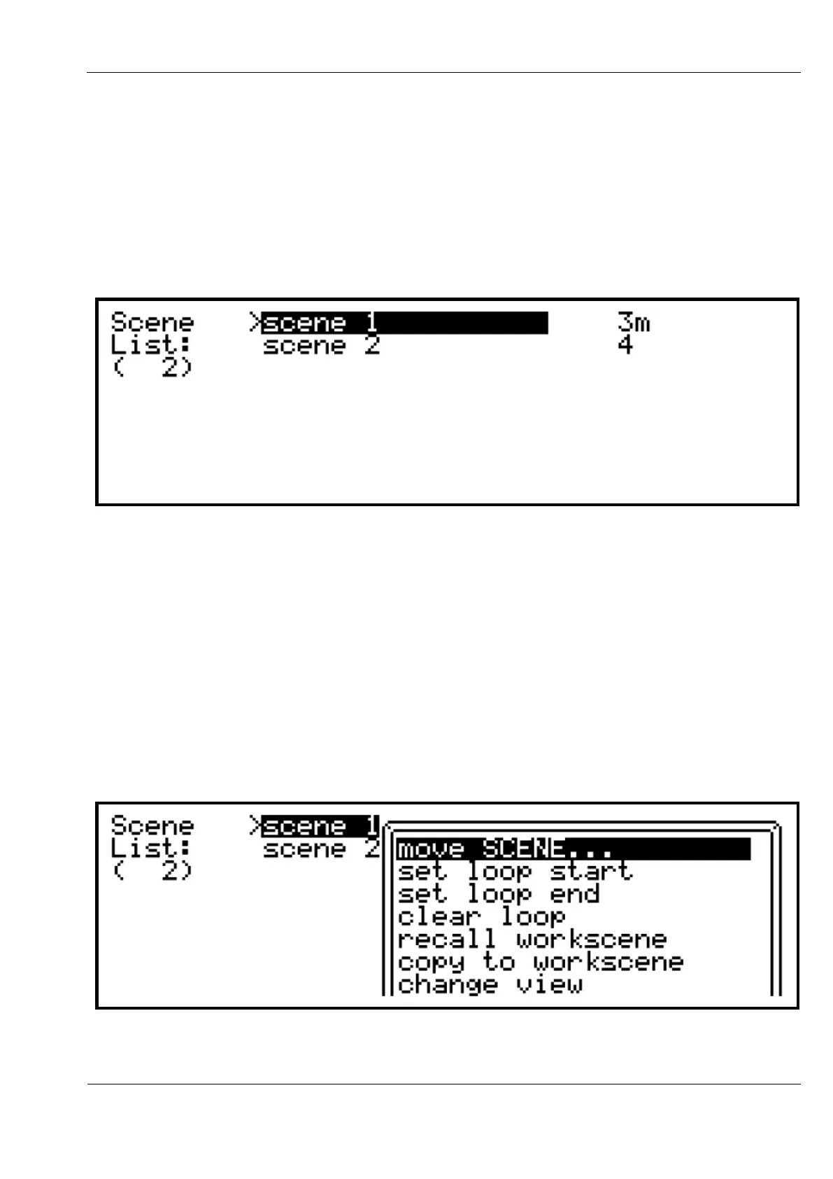The scene list provides some other scene operations, accessed by pressing the MENU key: