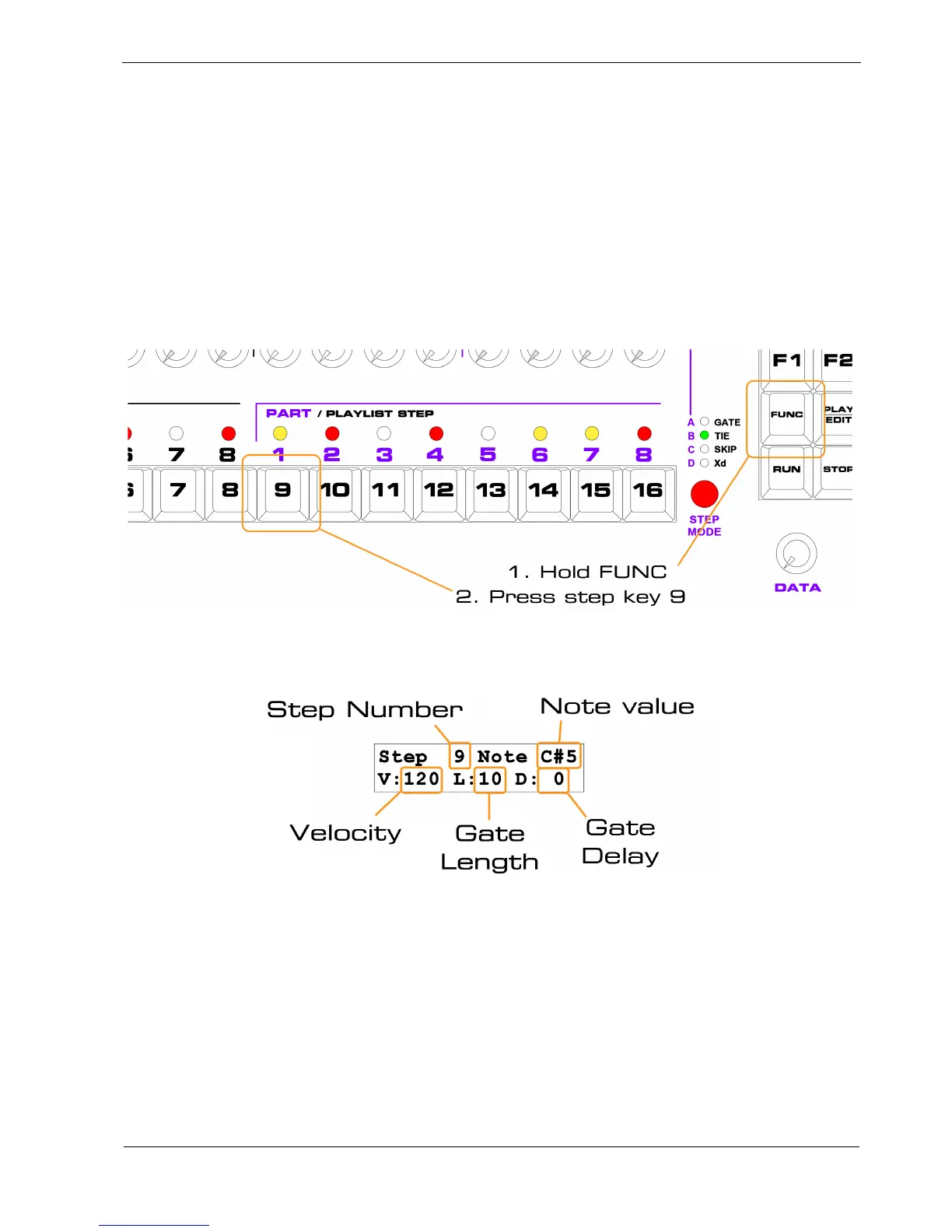 When you press the step key, the display will briefly show all the numeric values on that step, like this: