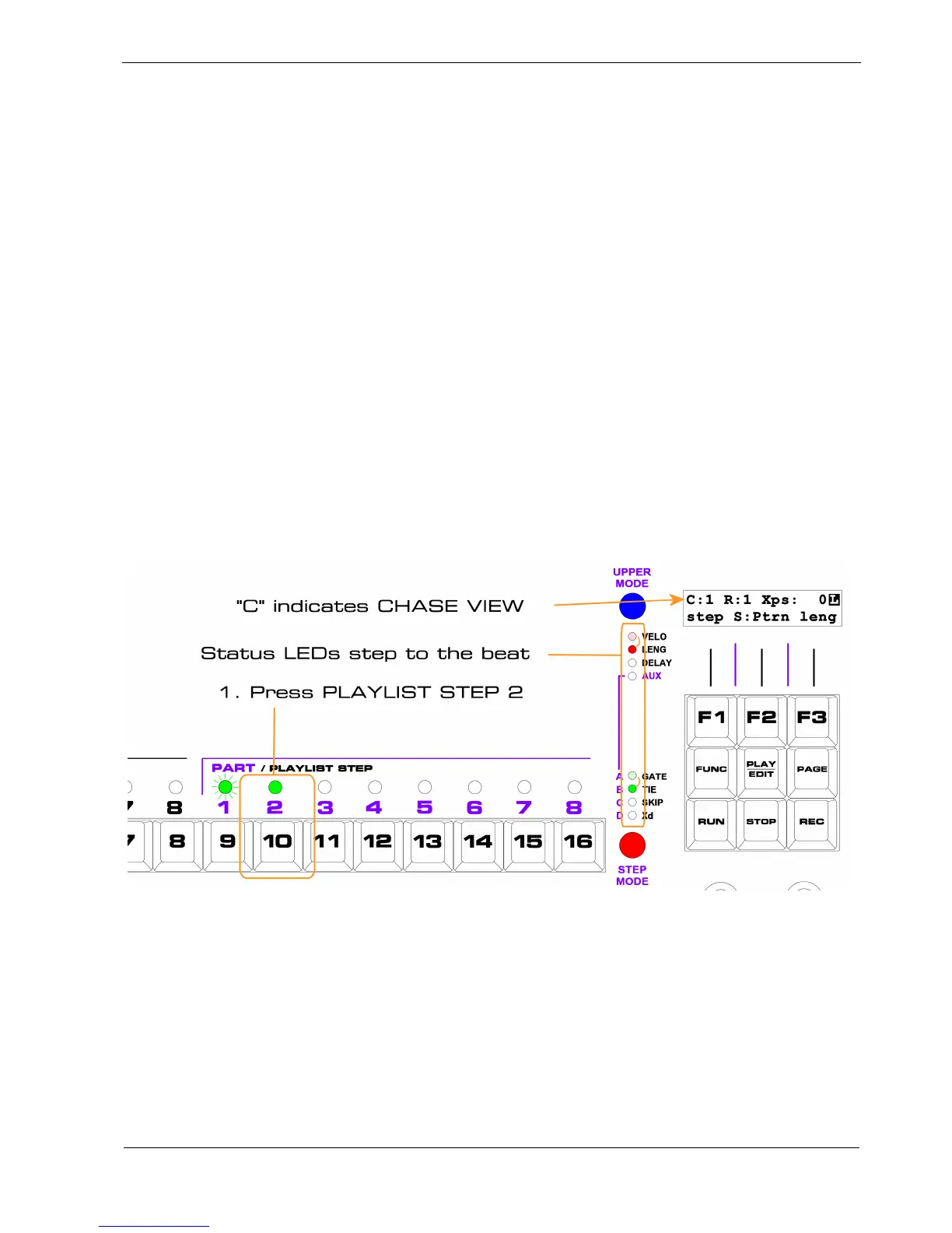 UPPER MODE and STEP MODE status LEDs light up and “chase” downwards by one step on each