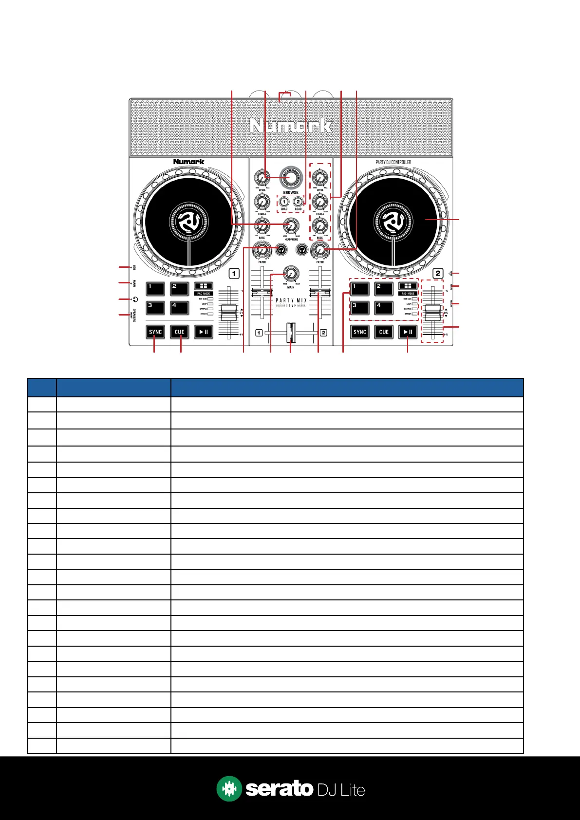 12 PLAY / PAUSE Toggles Play/Pause on selected deck