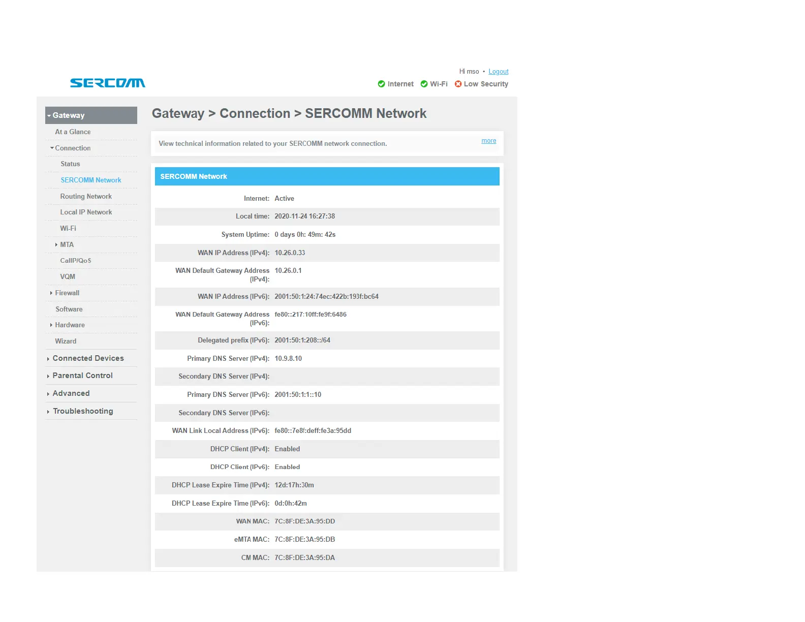 Sercomm DG4244 - SERCOMM Network Connection Details; WAN IP and Gateway Information; DNS and MAC Address Information