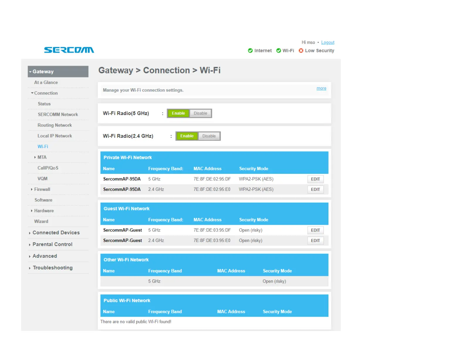 Sercomm DG4244 - Wi-Fi Network Setup and Management; Wi-Fi Radio Control Options; Private Wi-Fi Network Management; Guest and Other Wi-Fi Networks