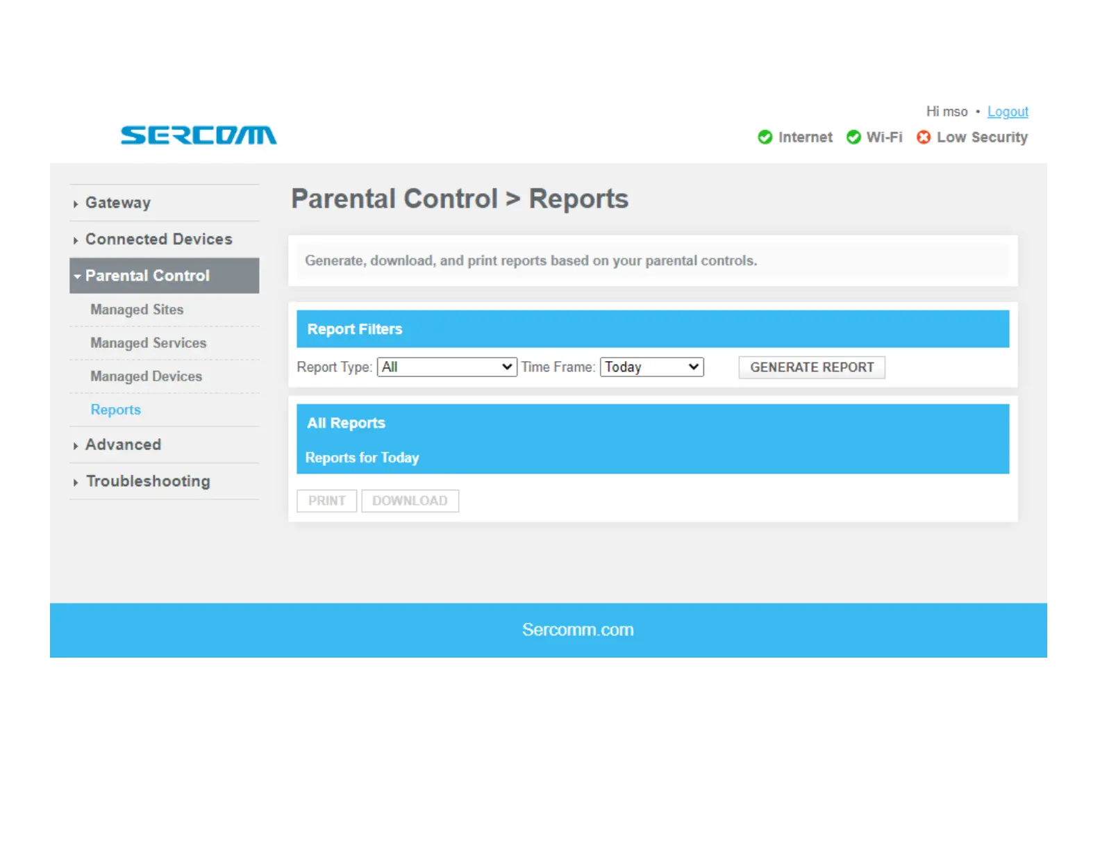 Sercomm DG4244 - Parental Control: Reports and Logging; Report Generation and Filtering; Viewing and Downloading Reports