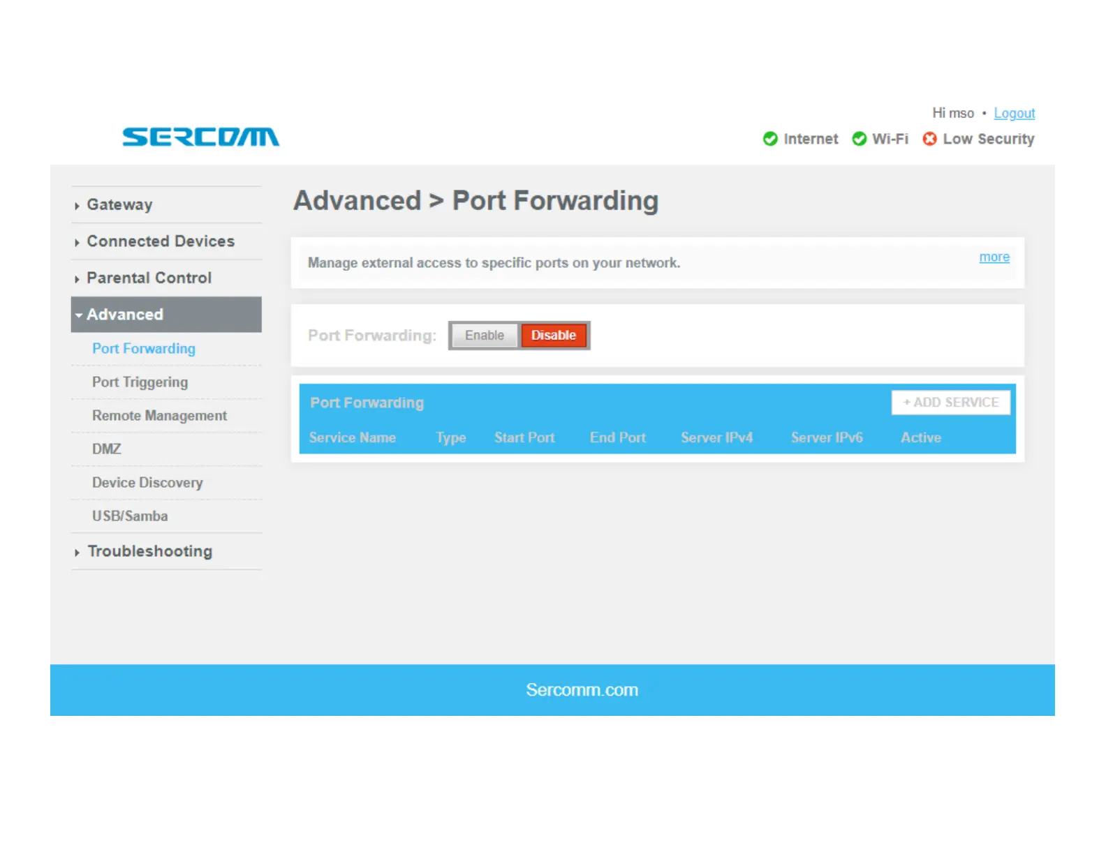 Sercomm DG4244 - Advanced Settings: Port Forwarding; Port Forwarding Configuration; Port Forwarding Services List