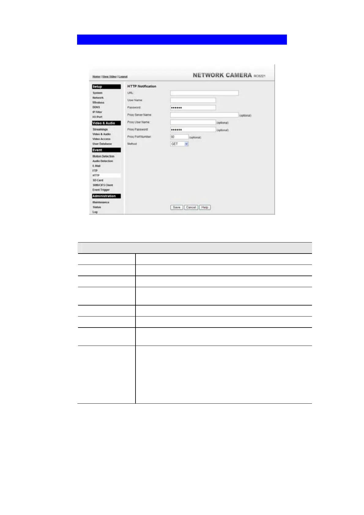 This screen is displayed when the HTTP option on the Event menu is clicked.