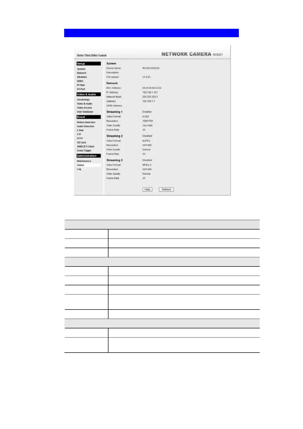 This shows the description of the Network Camera, such as location.