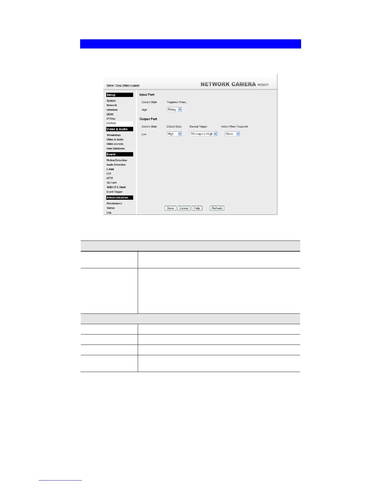 The Network Camera supports 1 input port and 1 output port. This screen is displayed when
