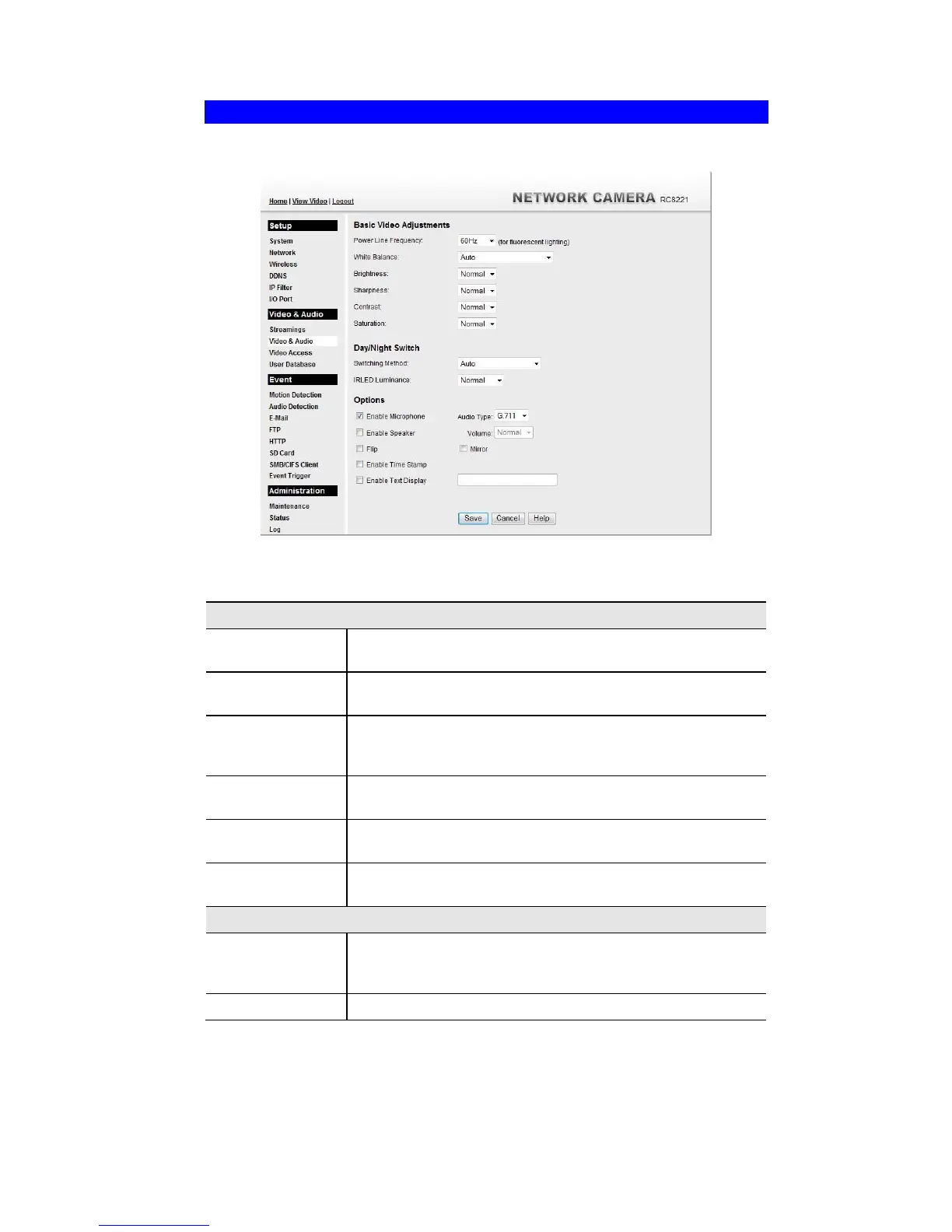 This screen is displayed when the Video & Audio menu option is clicked.