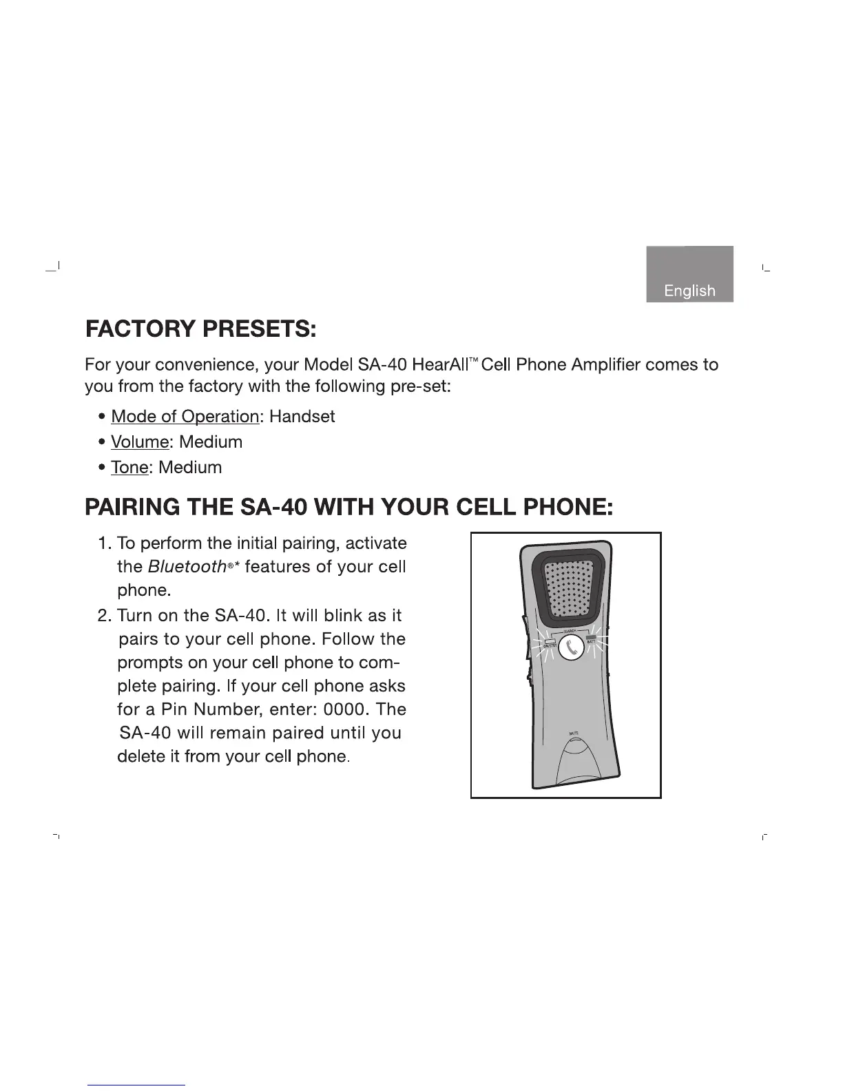 Serene HearAll - INITIAL SETUP; Factory Presets; Pairing with Cell Phone
