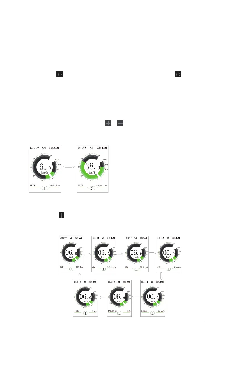 Range (RANGE) - Energy consumption (CALORIES(only with torque sensor fitted)) - Travel time (TIME).