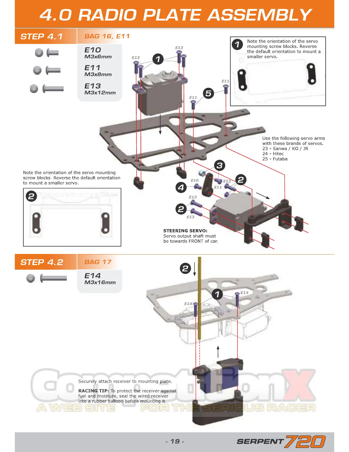 Serpent 720 - 4.0 RADIO PLATE ASSEMBLY; SERVO MOUNTING ON RADIO PLATE; RECEIVER MOUNTING ON PLATE