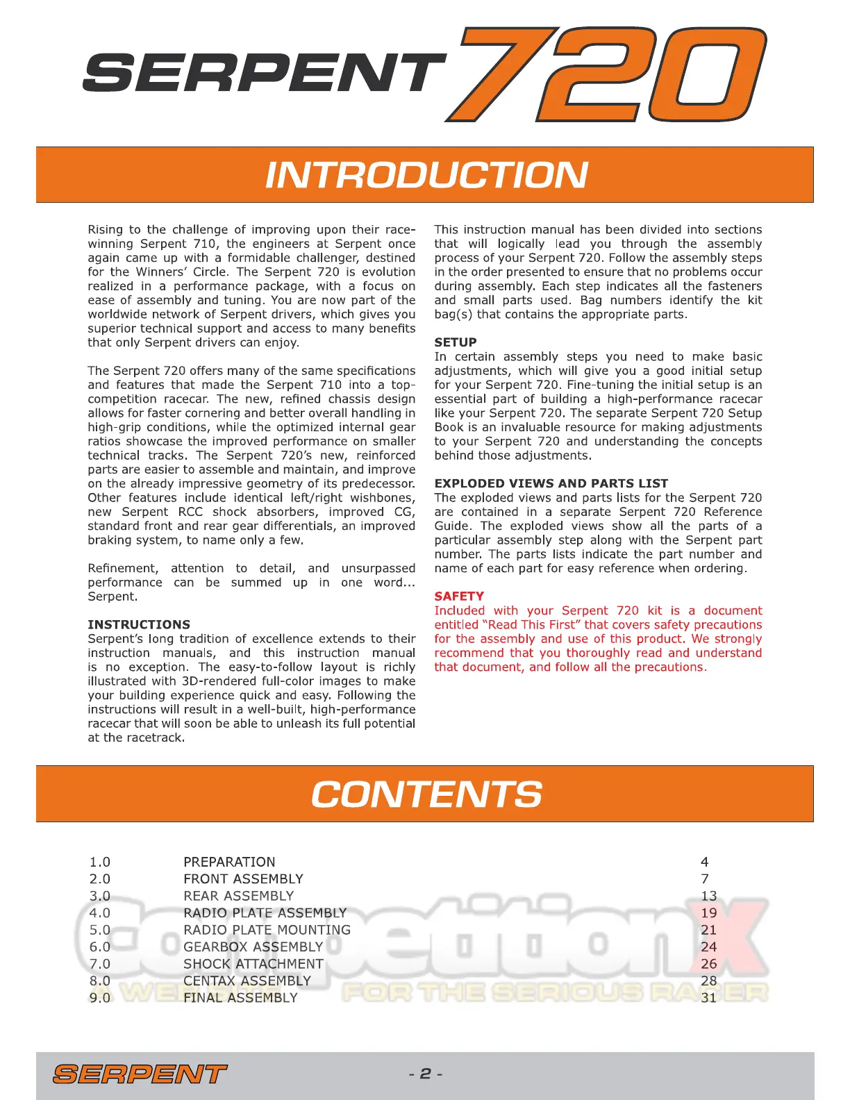 Serpent 720 - INTRODUCTION; SETUP OVERVIEW; EXPLODED VIEWS AND PARTS LIST REFERENCE; SAFETY PRECAUTIONS