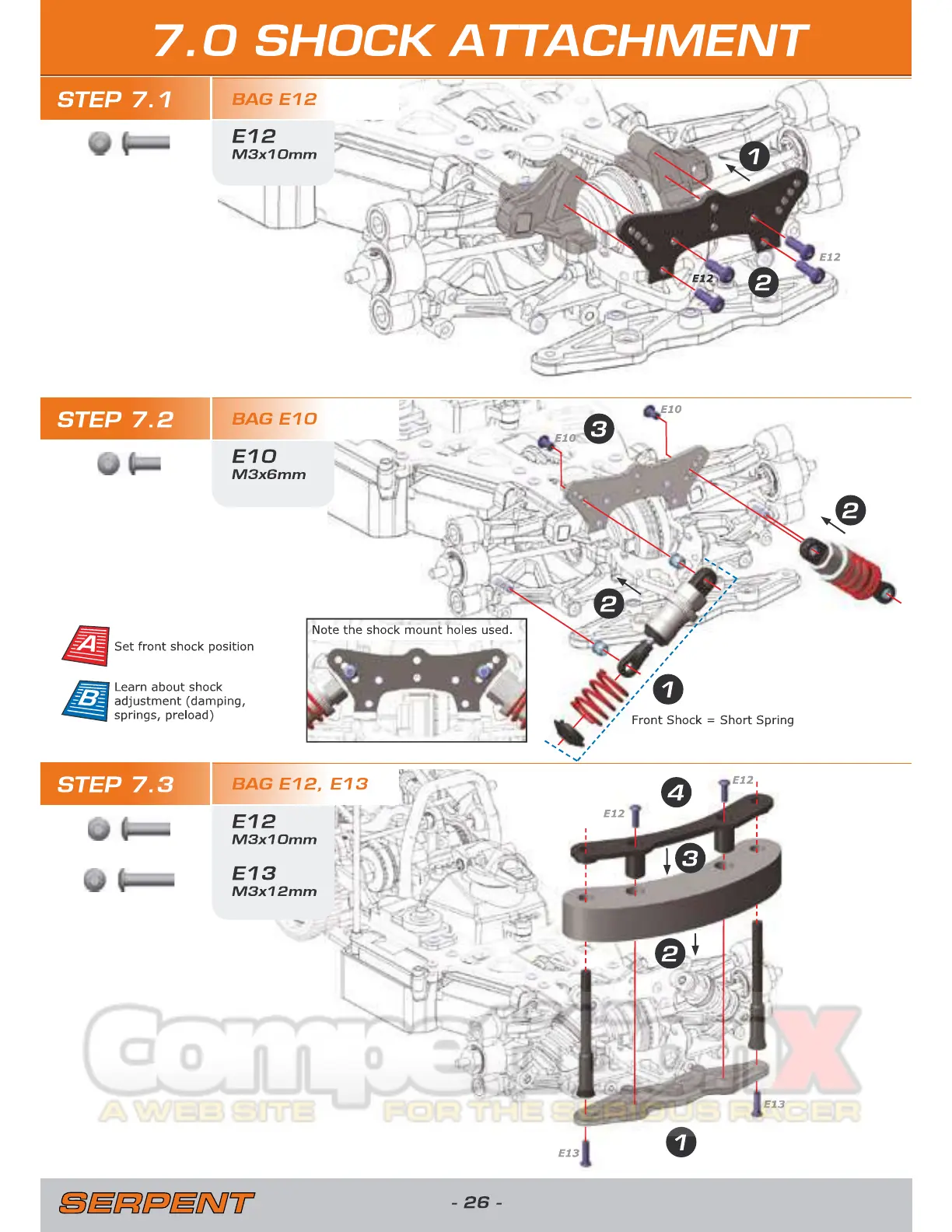 Serpent 720 - 7.0 SHOCK ATTACHMENT; FRONT SHOCK TOWER MOUNTING; FRONT SHOCK POSITION AND PRELOAD SETTING; FRONT SHOCK ABSORBER ASSEMBLY