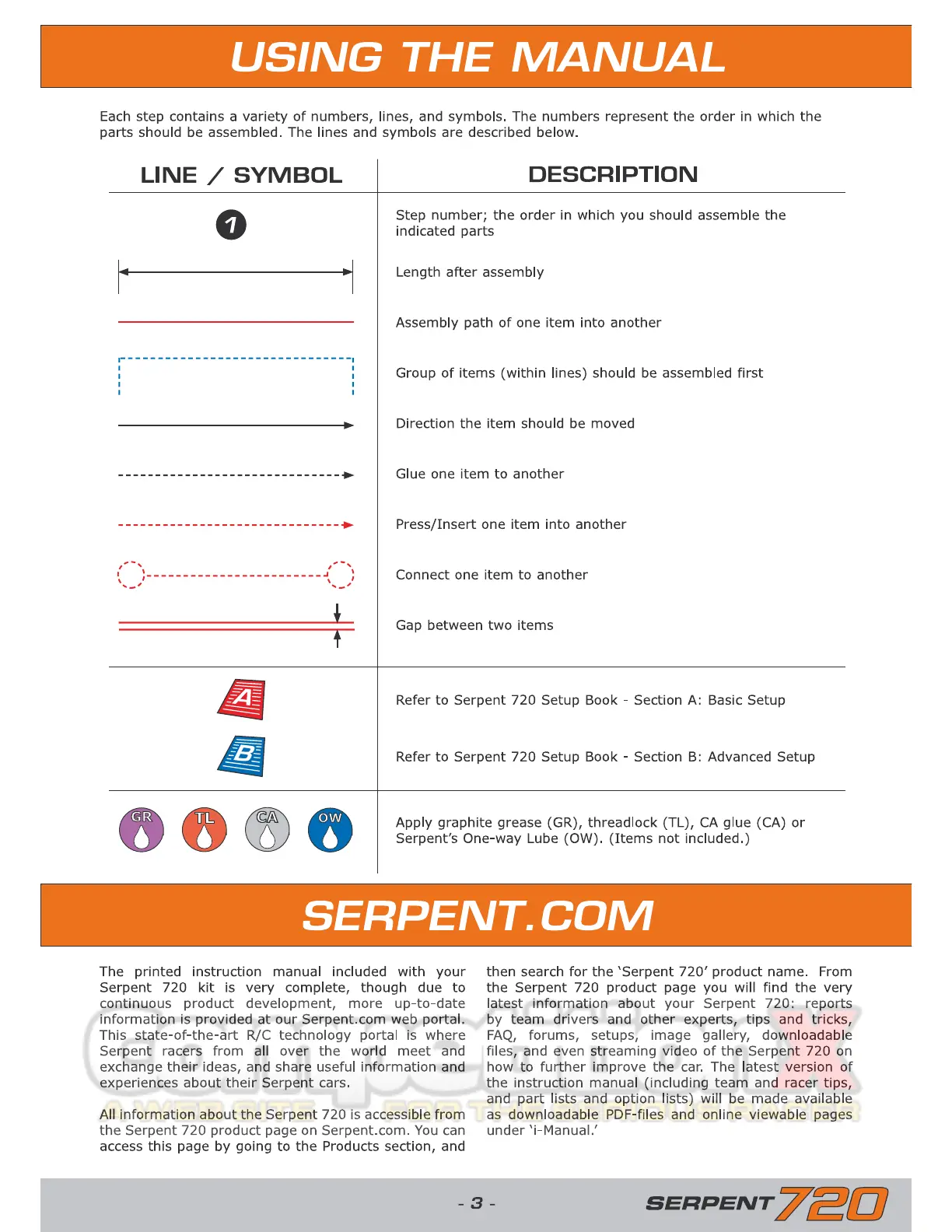 Serpent 720 - USING THE MANUAL; ASSEMBLY SYMBOLS EXPLANATION; SERPENT.COM WEBSITE INFORMATION