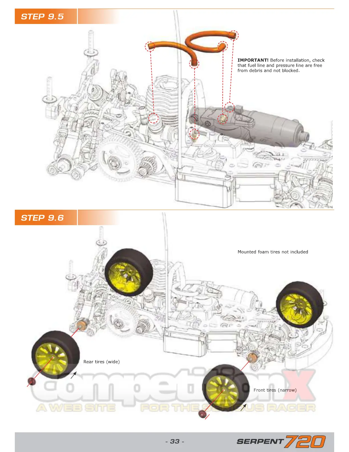 Serpent 720 - FUEL AND PRESSURE LINE INSTALLATION AND CHECK; FRONT AND REAR TIRE MOUNTING