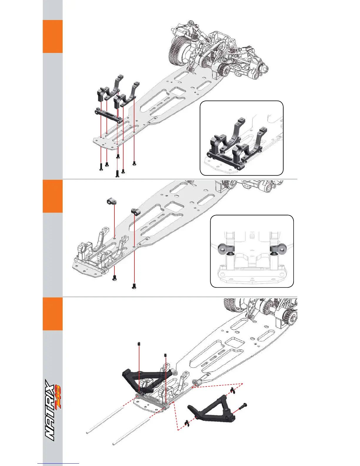 Serpent Natrix 748 - Front Assembly: Bearing Block Installation; Front Assembly: Suspension Bracket Installation; Front Assembly: Lower Suspension Arm Mount