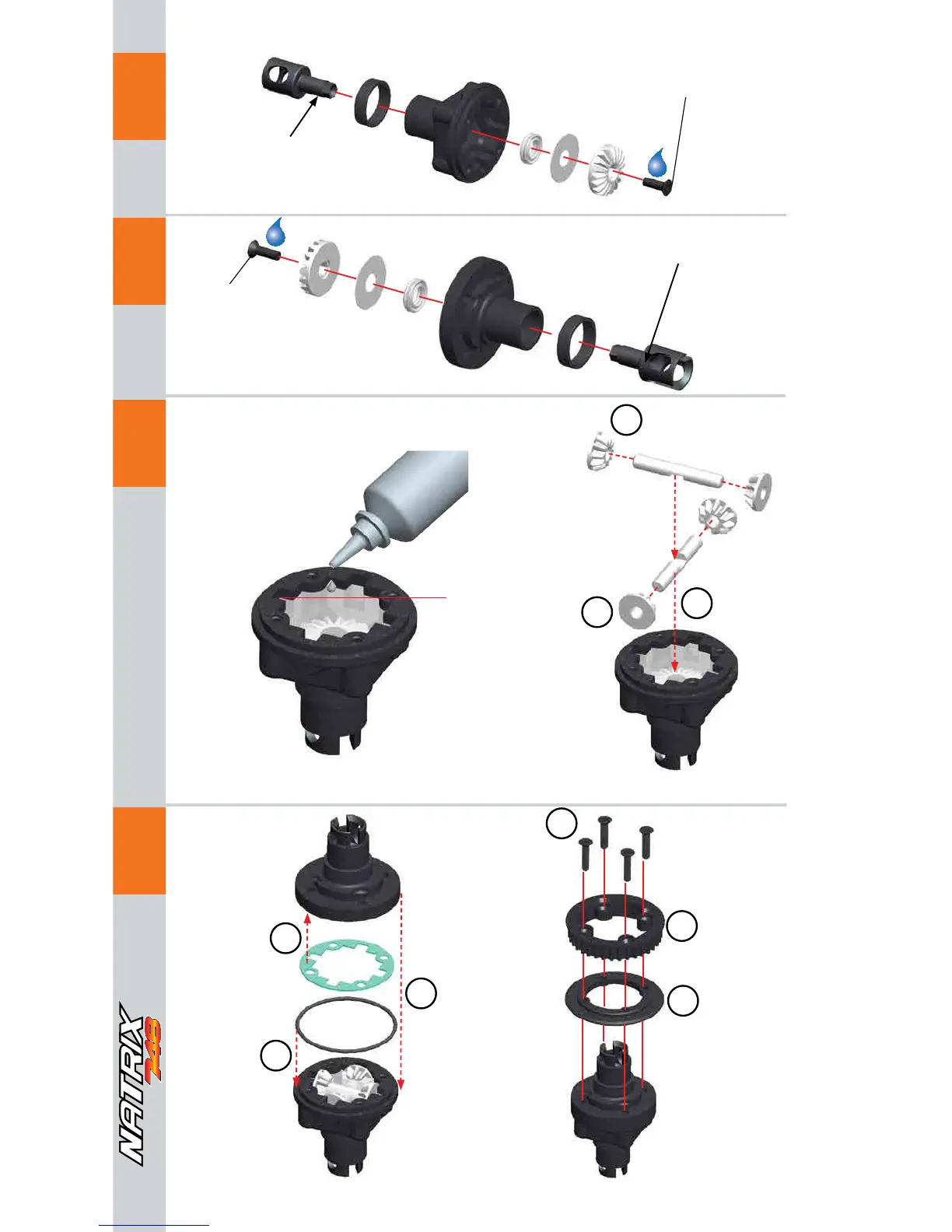 Serpent Natrix 748 - Front Differential Assembly; Front Diff: Initial Lubrication and Fastening; Front Diff: Second Fastening and Lubrication; Front Diff: Filling with Silicone Oil