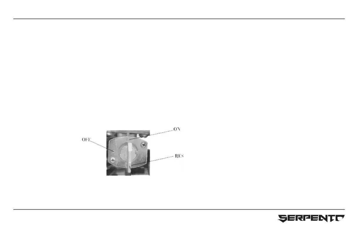 RES: Cuando la perilla de la válvula de combustible está en posición de “RES” el combustible fluye desde la reserva. (Nota: el combustible