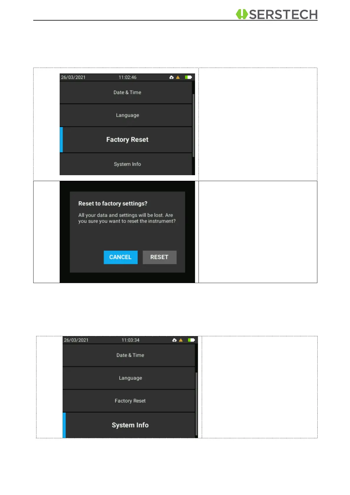 Serstech ARX - Factory Reset; System Information