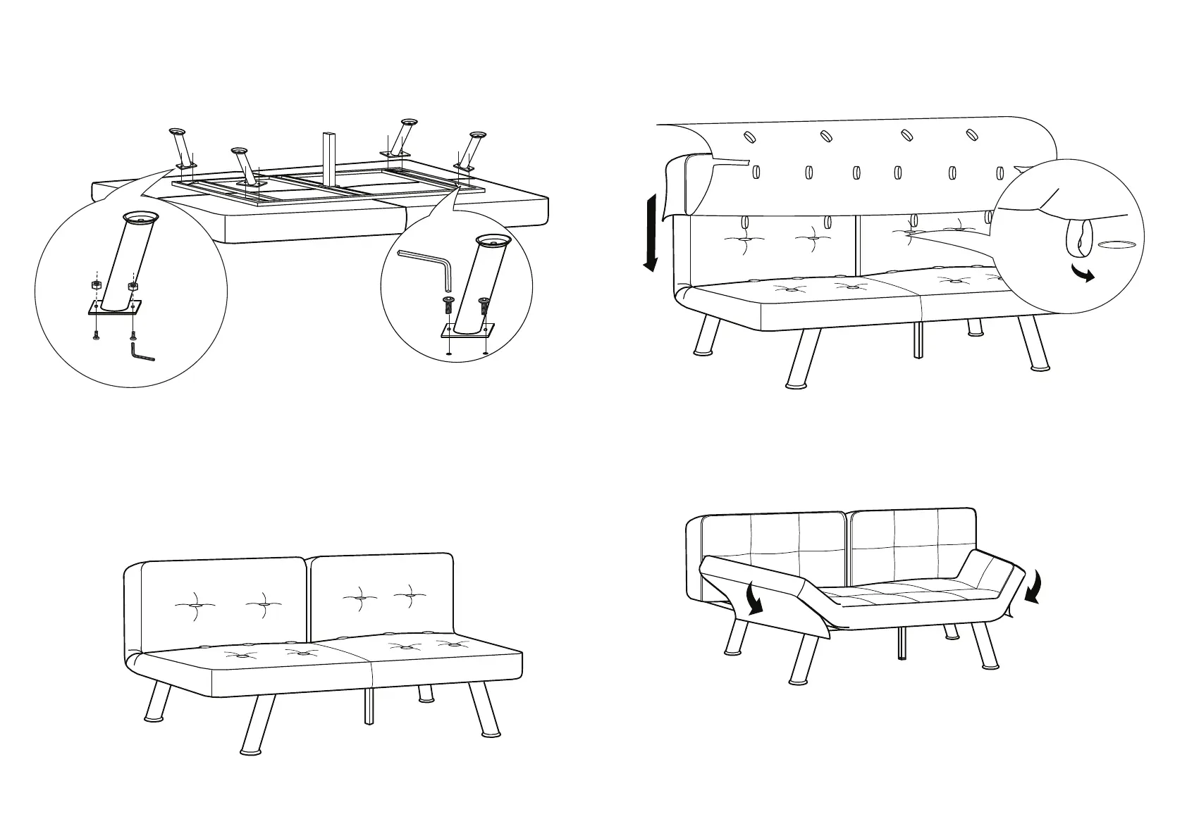 Carefully lift and turn assembled unit onto its legs. Lift backrest to sofa position as