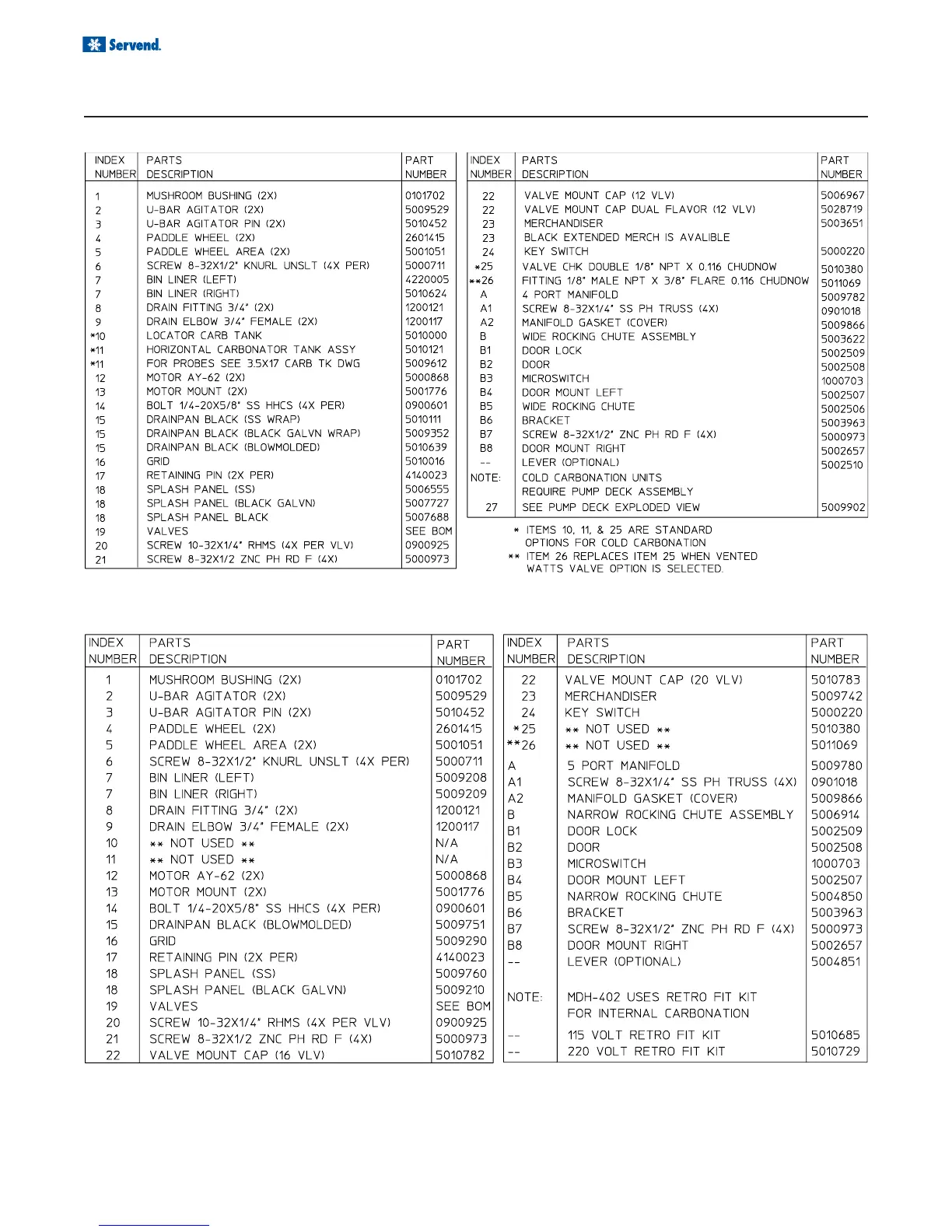 Servend MD 200 - MDH 302 Parts List; MDH 402 Parts List