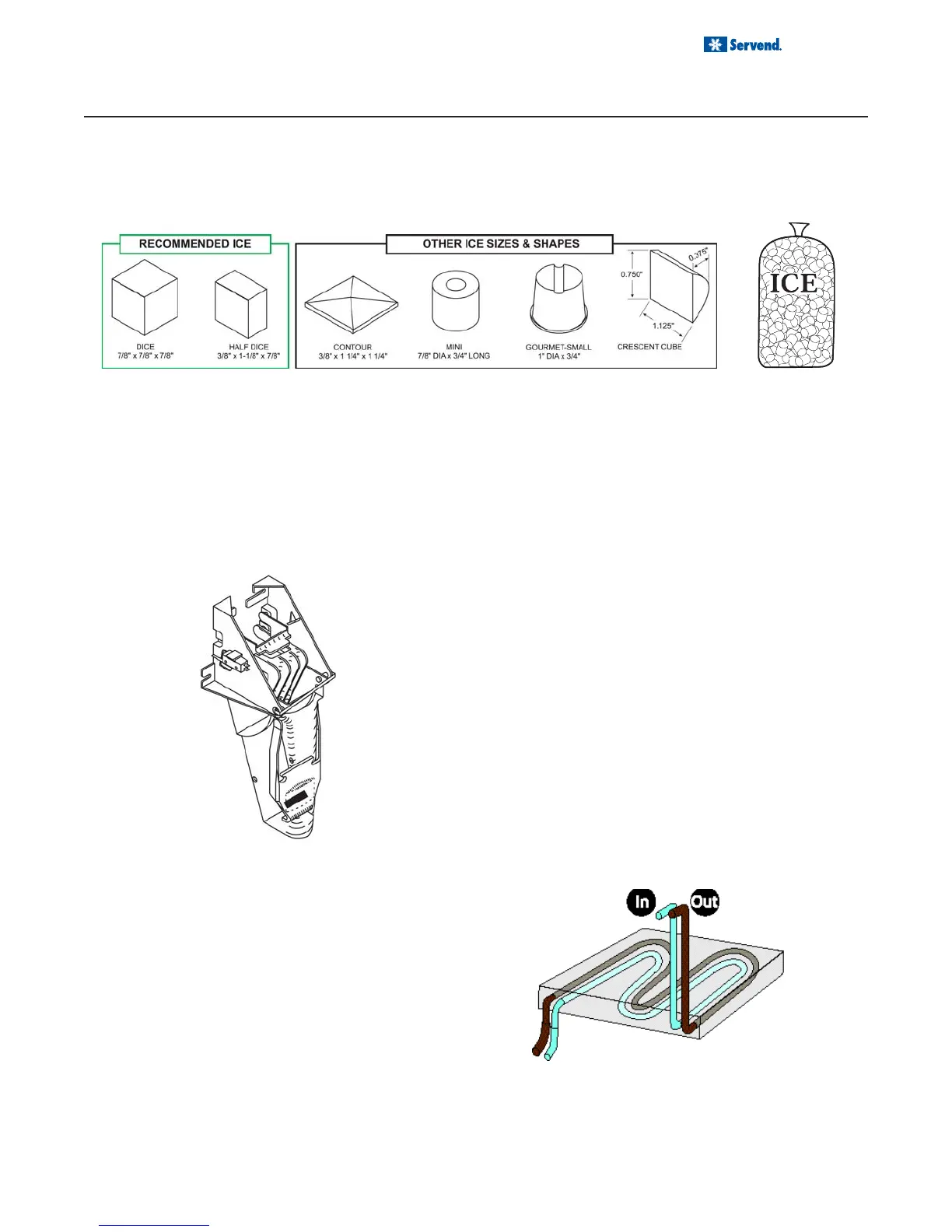 Servend dispensers are designed to dispense hard, cube ice up to one-inch square. The ice shapes and sizes listed