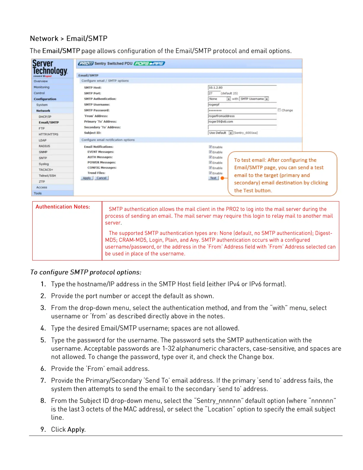 Server Technology PRO2 - Network > Email;SMTP; To configure SMTP protocol options: