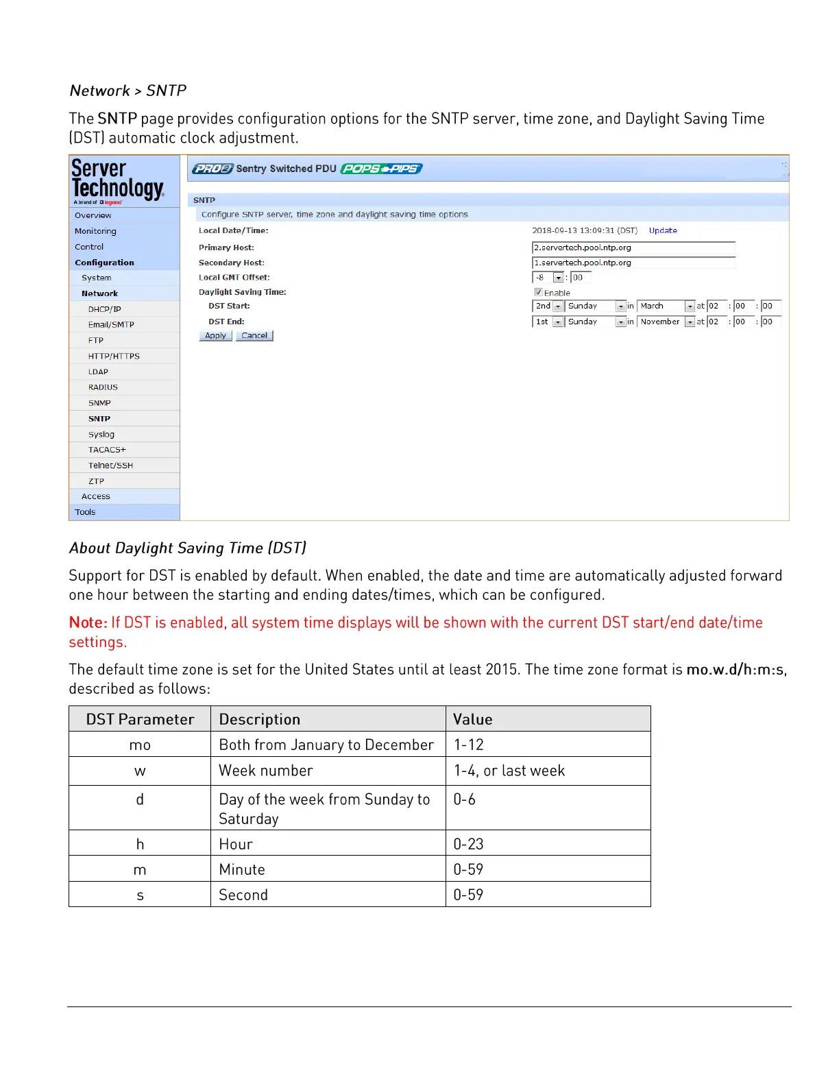 Server Technology PRO2 - Network > SNTP; About Daylight Saving Time (DST)