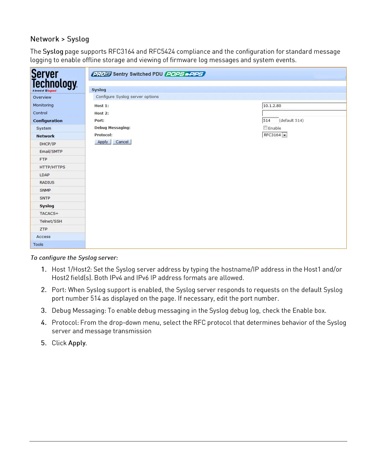 Server Technology PRO2 - Network > Syslog; To configure the Syslog server: