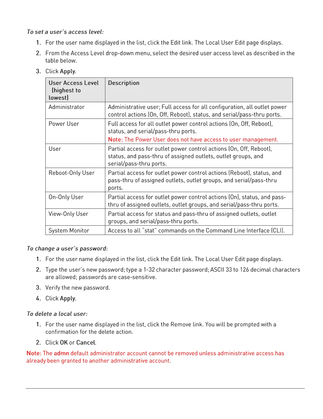 Server Technology PRO2 - To set a user’s access level:; To change a user’s password:; To delete a local user: