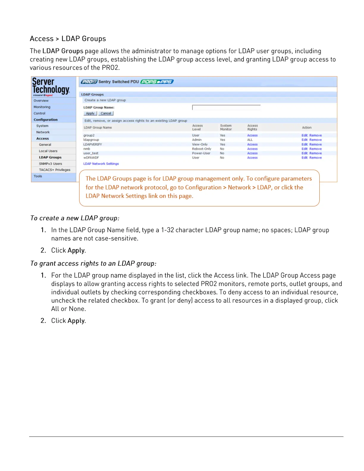Server Technology PRO2 - Access > LDAP Groups; To create a new LDAP group:; To grant access rights to an LDAP group: