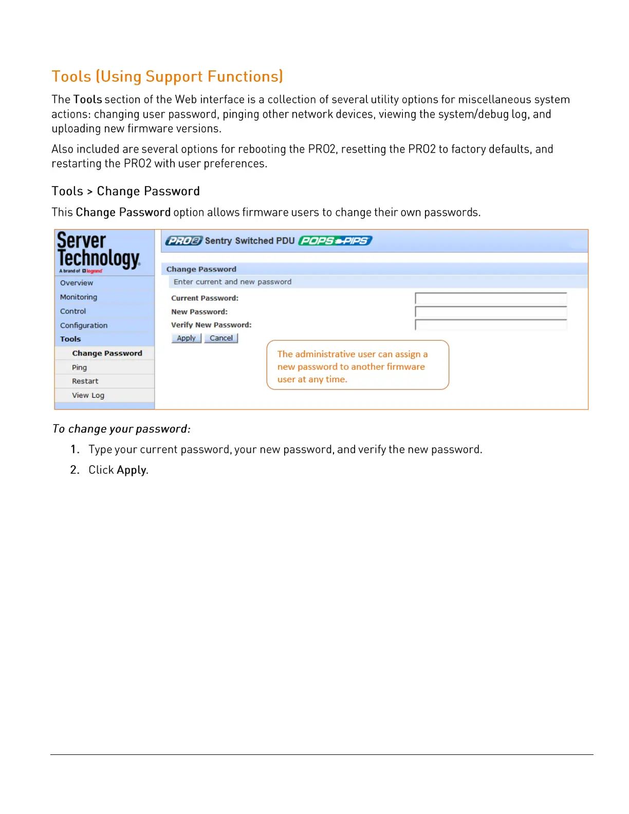 Server Technology PRO2 - Tools (Using Support Functions); Tools > Change Password; To change your password: