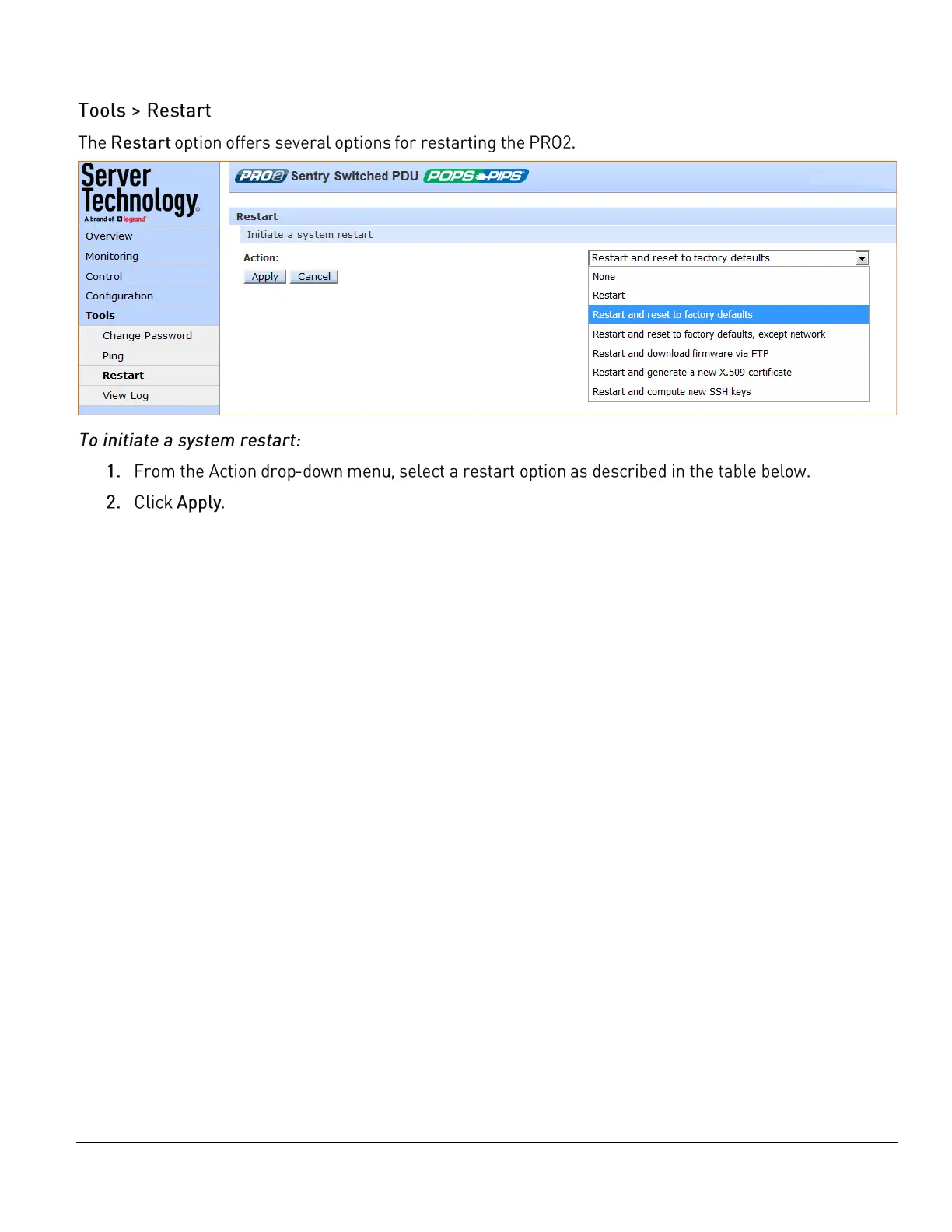 Server Technology PRO2 - Tools > Restart; To initiate a system restart: