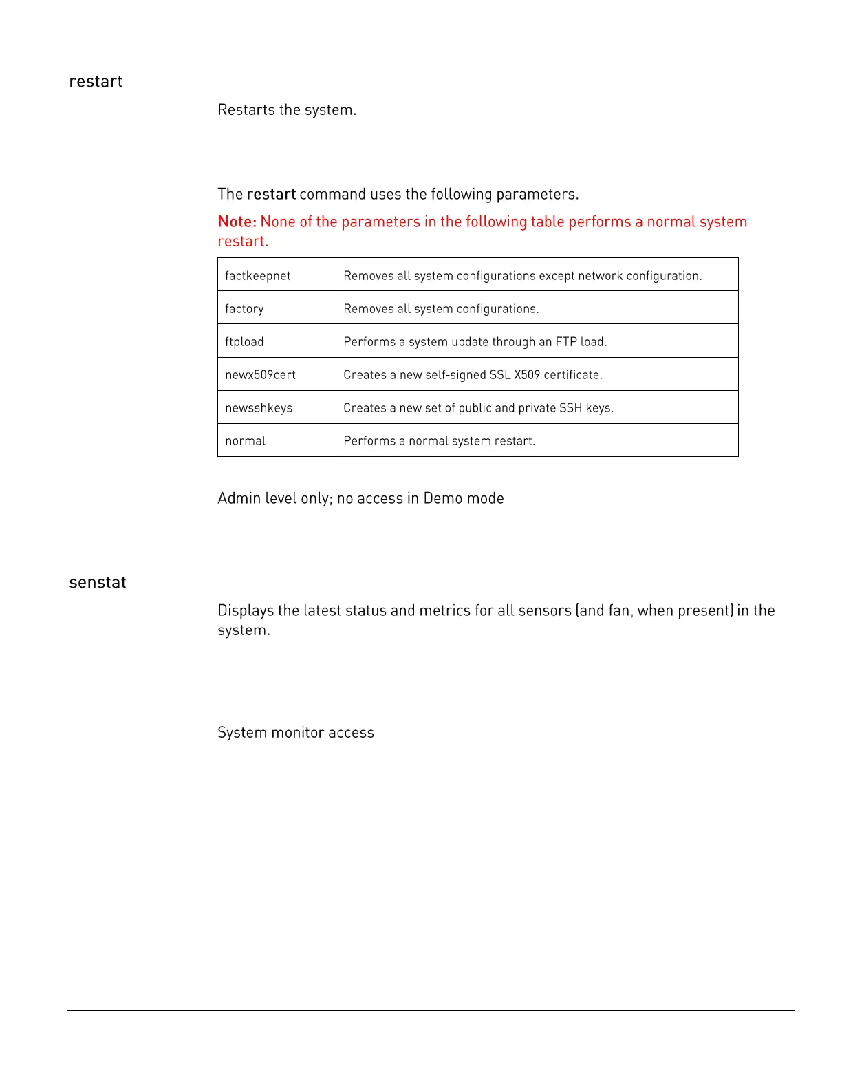 restart [factkeepnet | factory | ftpload | newx509cert | newsshkeys | normal]