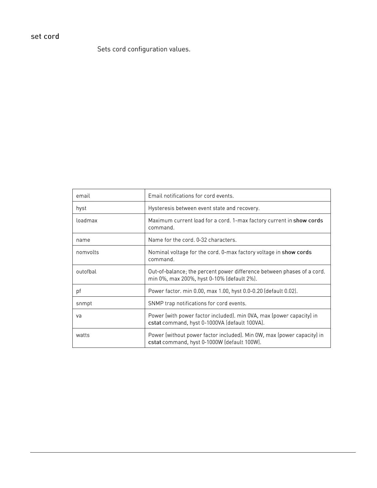 set cord watts [alarmhi | alarmlo | warnhi | warnlo] <name | id | ALL> <value>