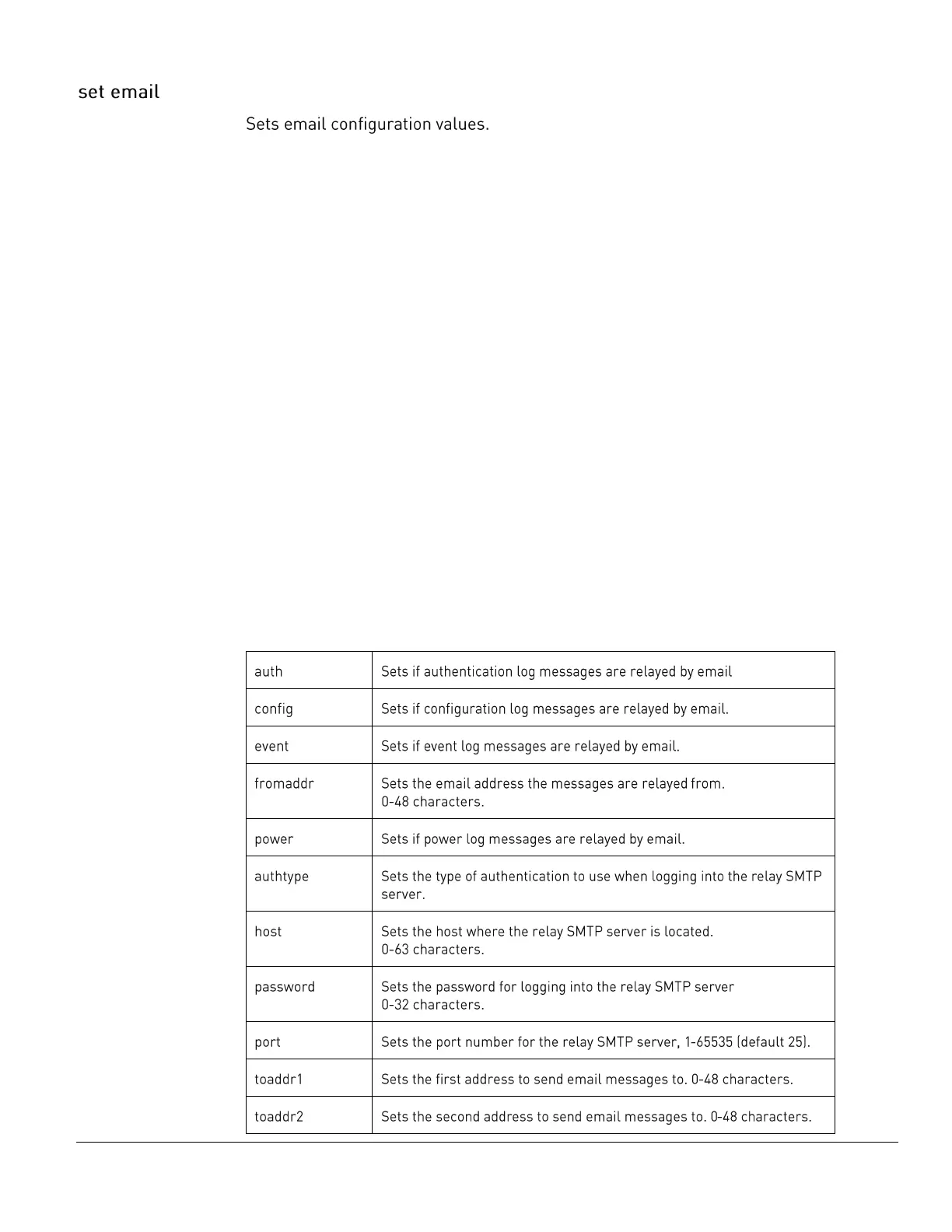 The set email command uses the following parameters: