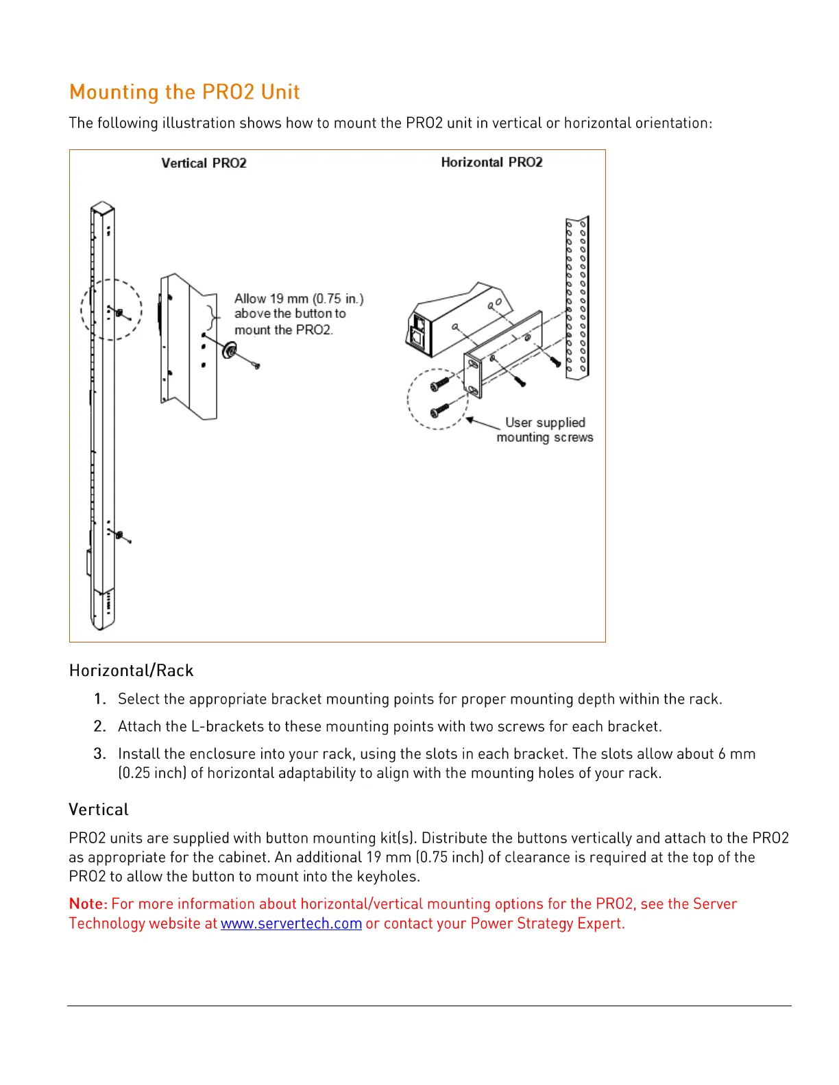 Server Technology PRO2 - Mounting the PRO2 Unit; Horizontal;Rack; Vertical