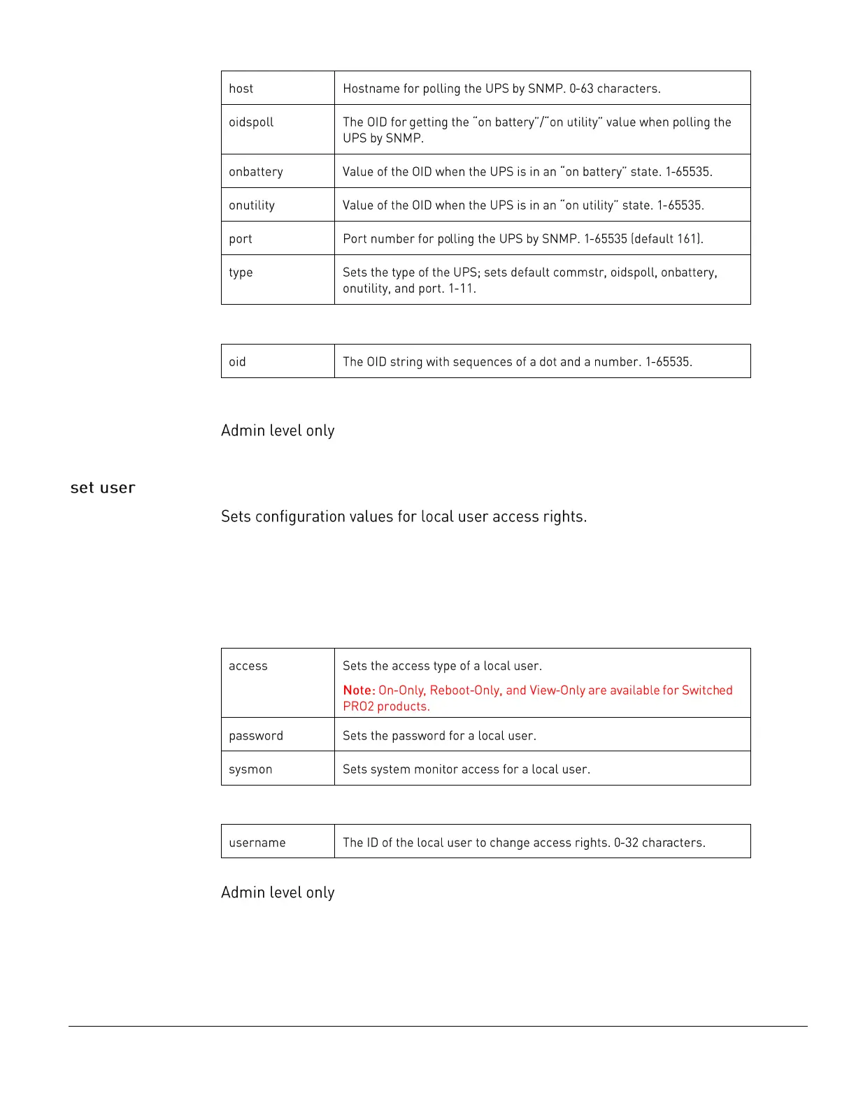 set user access [admin | ononly | poweruser | rebootonly | user | viewonly] <username>