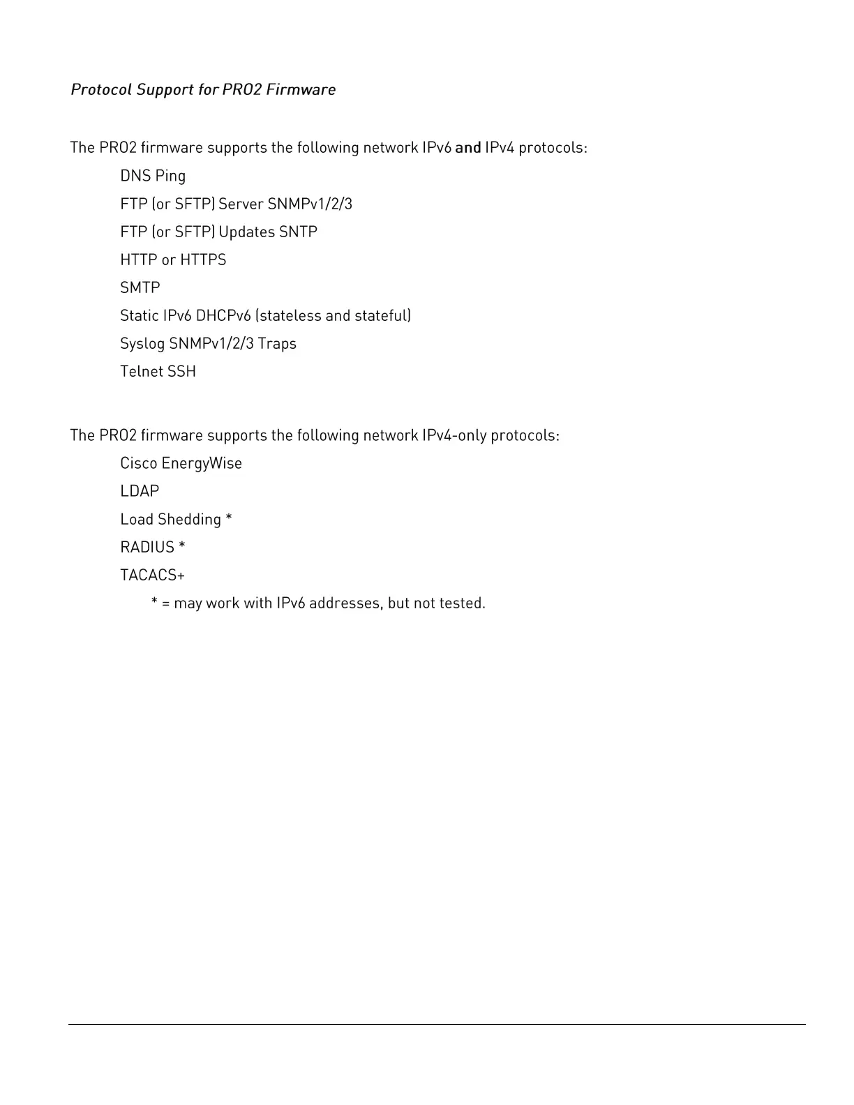 Server Technology PRO2 - Protocol Support for PRO2 Firmware; IPv6 and IPv4 Protocols:; IPv4-Only Protocols: