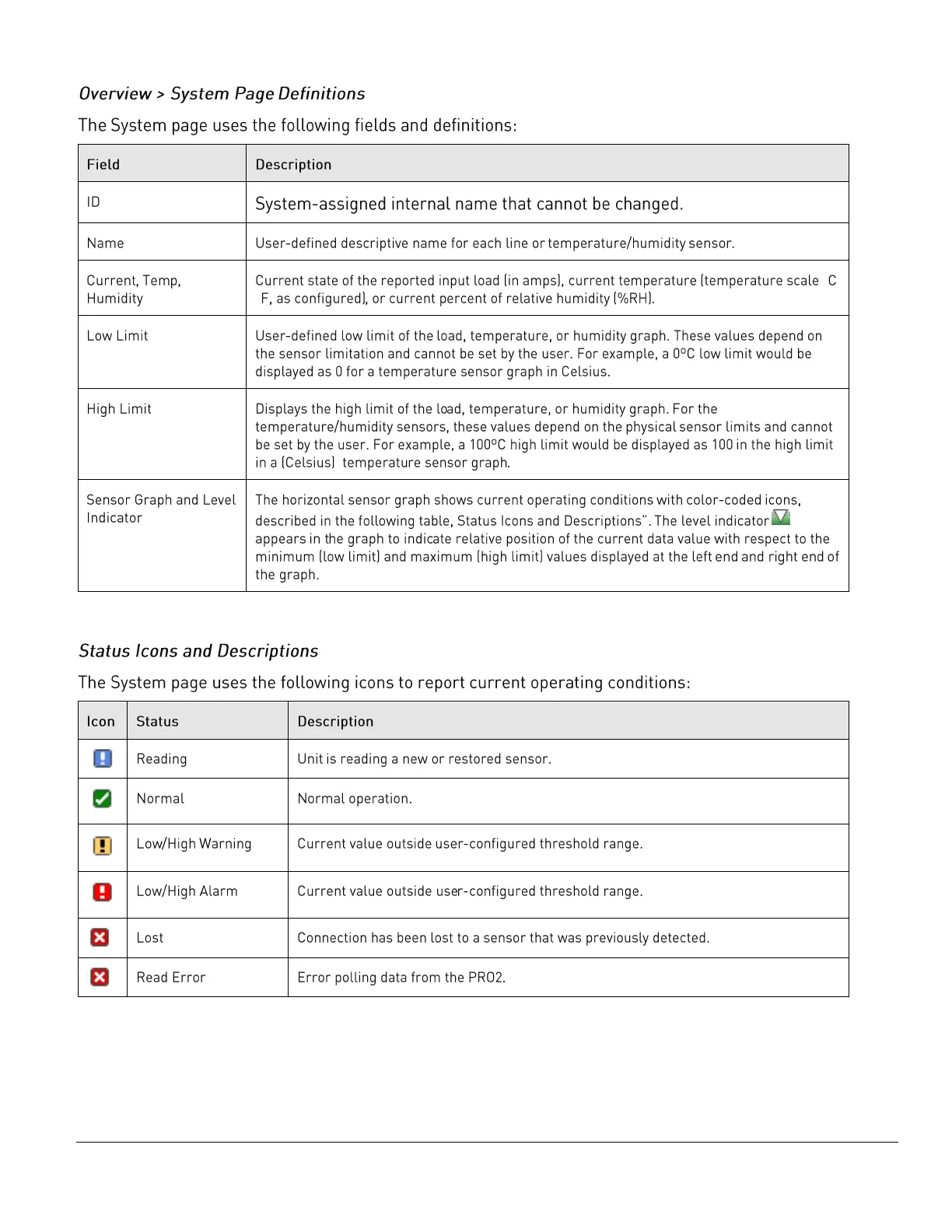 Server Technology PRO2 - Overview > System Page Definitions; Status Icons and Descriptions