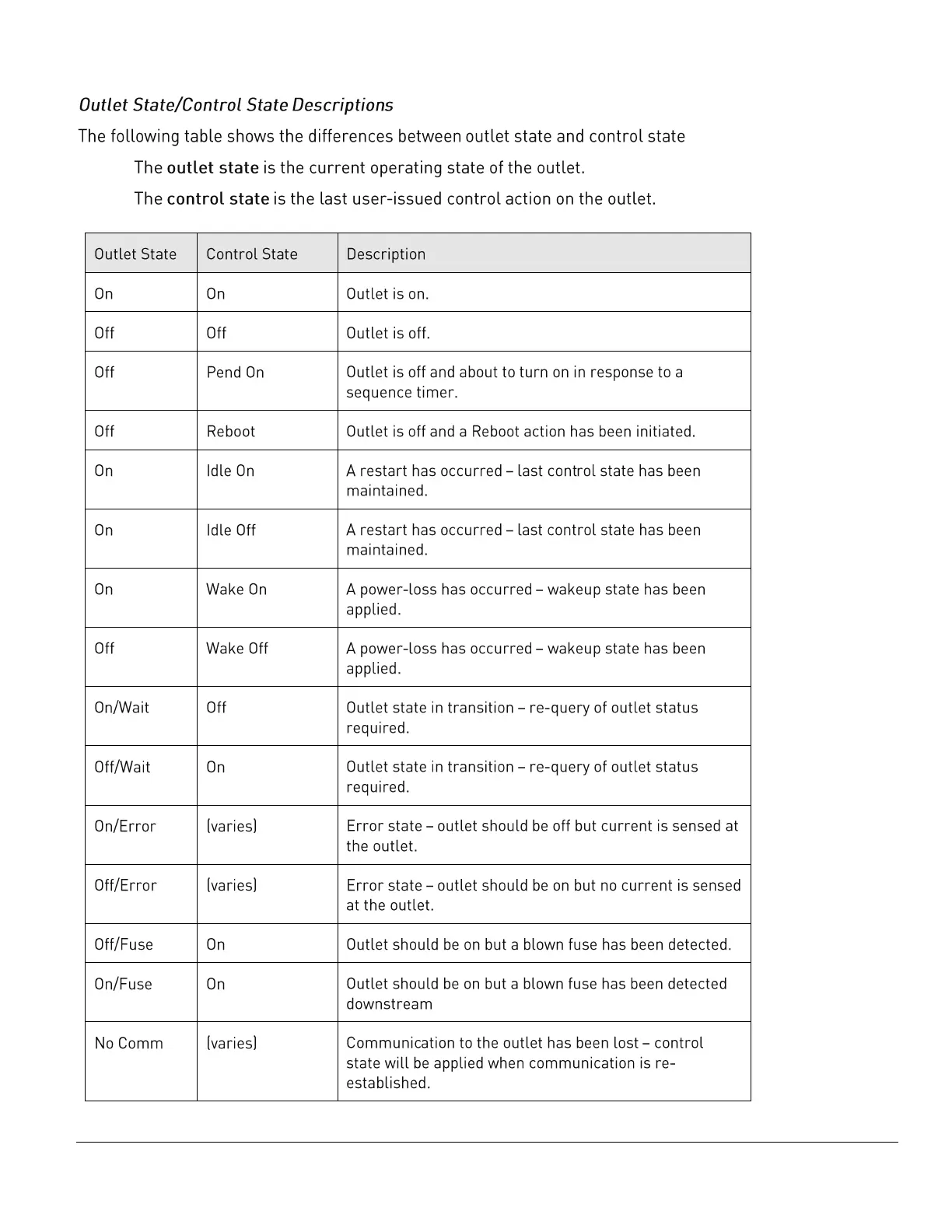 Server Technology PRO2 - Outlet State;Control State Descriptions