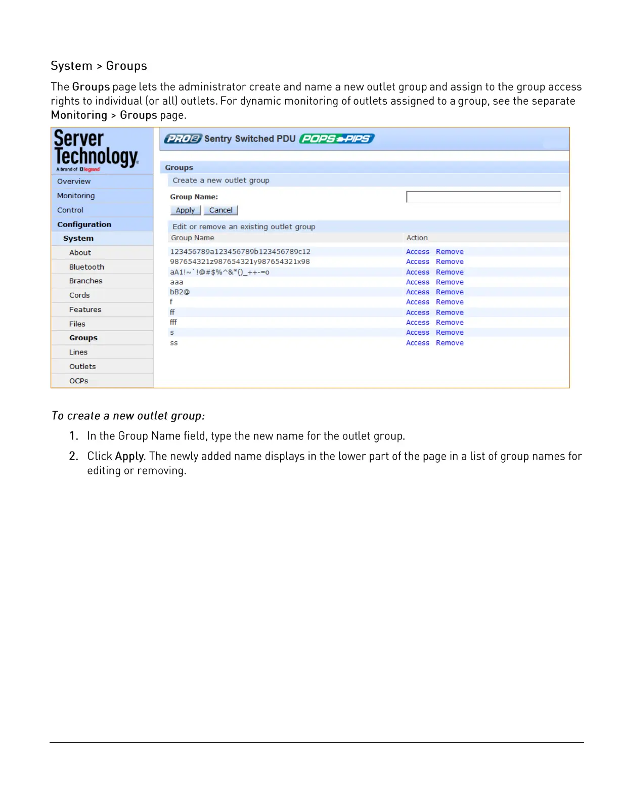 Server Technology PRO2 - System > Groups; To create a new outlet group: