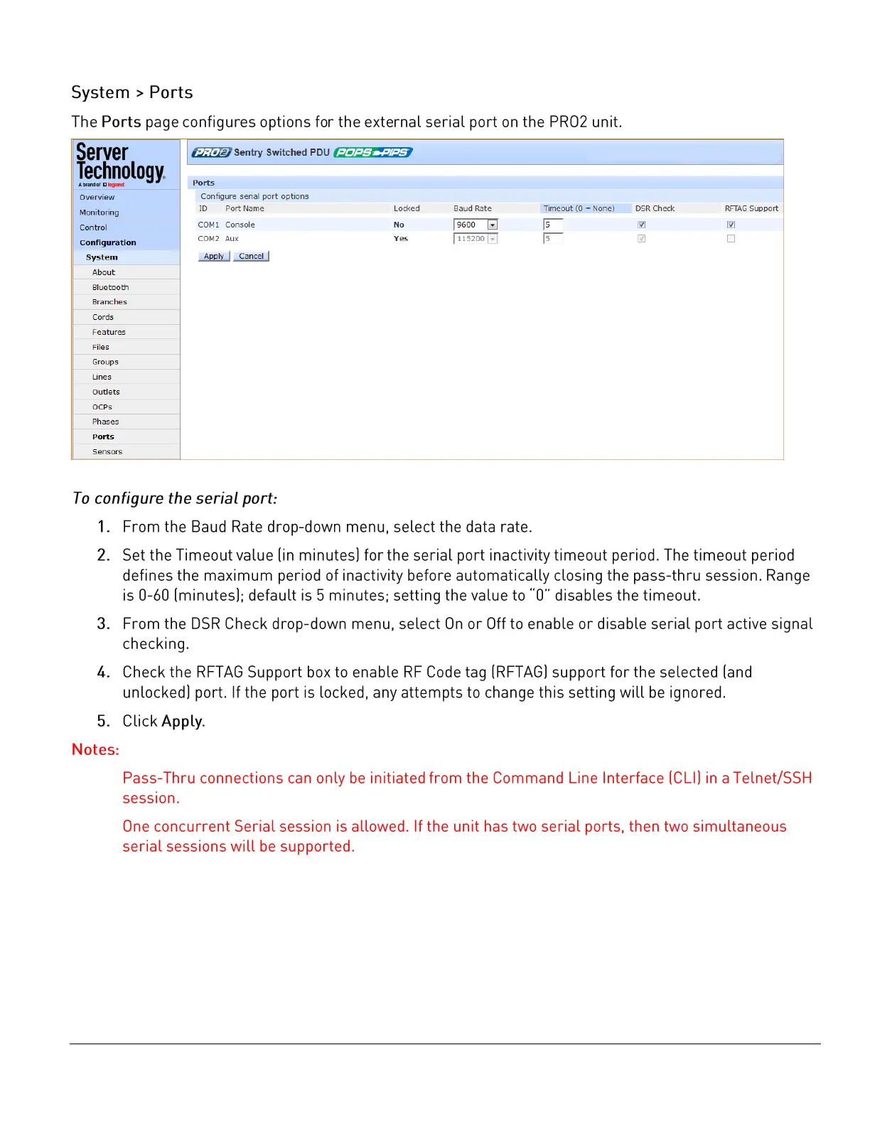 Server Technology PRO2 - System > Ports; To configure the serial port: