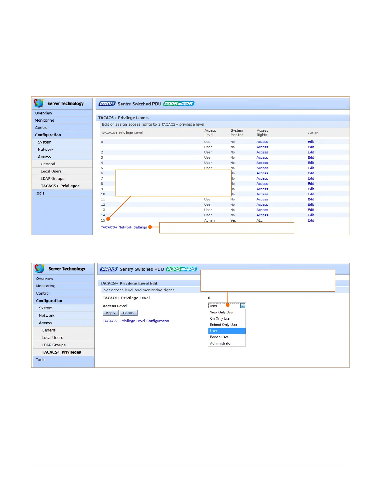 The PRO2 supports 16 different TACACS+ privilege levels. The administrative-level user can configure 15 privilege