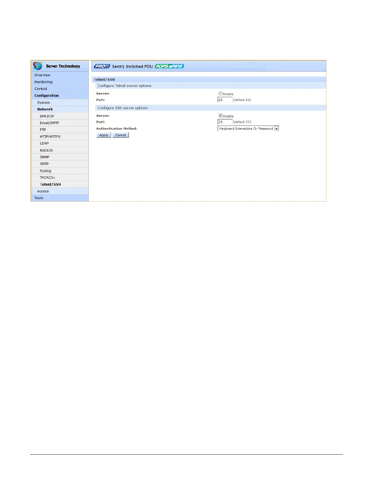 1. Server: Check (or uncheck) the Enable checkbox to enable/disable support for Telnet and/or SSH.