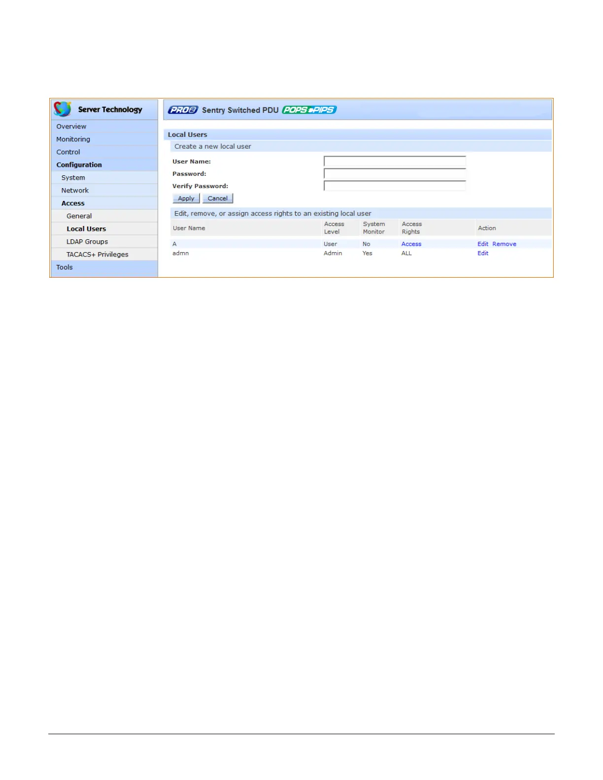 1. For the user name displayed in the list, click the Access link. The Local User Access page displays to allow