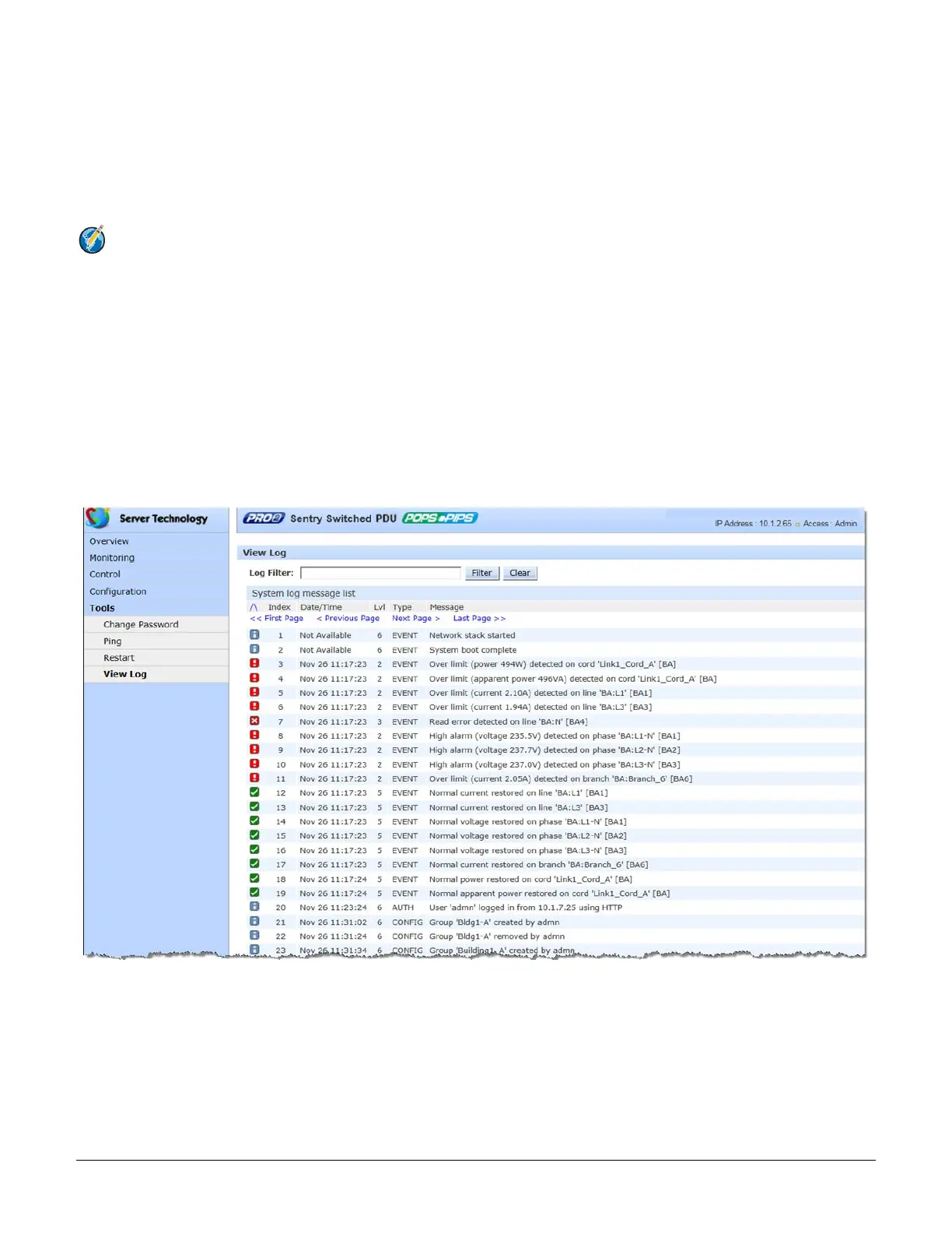 This tool displays the internal system event log for viewing by the administrative user. The log records all